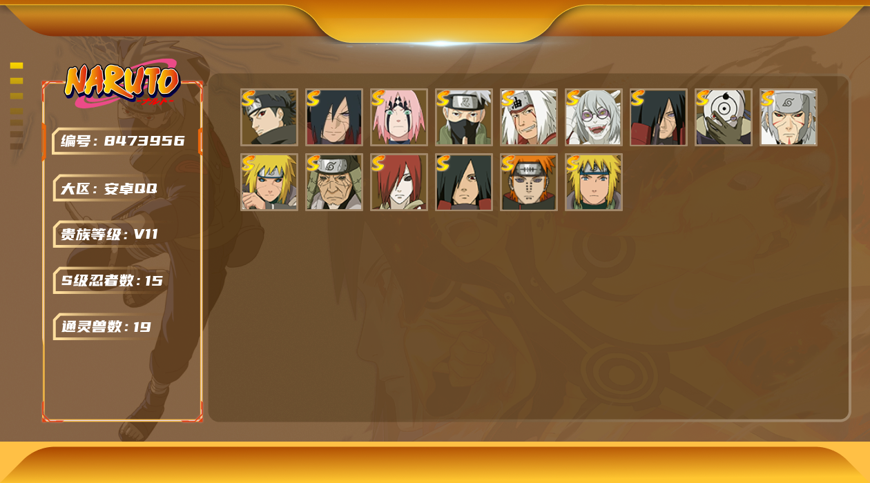 [8473956]实名: 可修改 贵族等级: v11 s忍数: 15 a忍数: 36 s级忍者: 药师兜「仙人模式」宇智波斑「秽土转生」千手扉间「秽土转生」波风水门「秽土转生」猿飞日斩「秽土转生」长门「秽土转生」宇智波斑佩恩「天道」波风水门宇智波斑 「白面具」春野樱 「忍界大战」宇智波斑「秽土转生·解」宇智波止水「须佐能乎」旗木卡卡西「须佐能乎」自来也 「传说中的三忍」