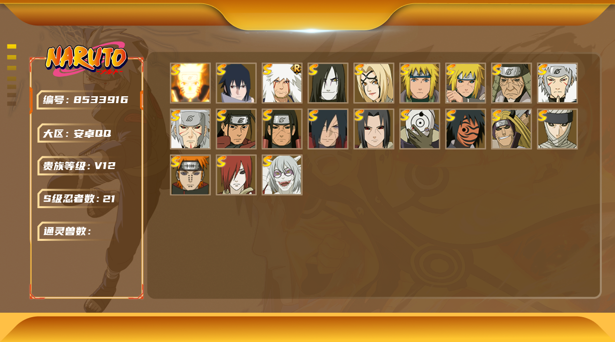 [8533916]v12 21s 可二次 s级忍者:宇智波斑「秽土转生·解」宇智波佐助「永恒万花筒」神秘面具男 「红夜之刃」漩涡鸣人 「九喇嘛连结」千手柱间「秽土转生」自来也 「舞之豪杰」宇智波鼬「秽土转生」药师兜「仙人模式」“宇智波斑” 「白面具」千手扉间「秽土转生」纲手「百豪」波风水门「秽土转生」无「二代目土影」金角/银角「秽土转生」猿飞日斩「秽土转生」长门「秽土转生」千手柱间千手扉间佩恩「天道」波风水门大蛇丸