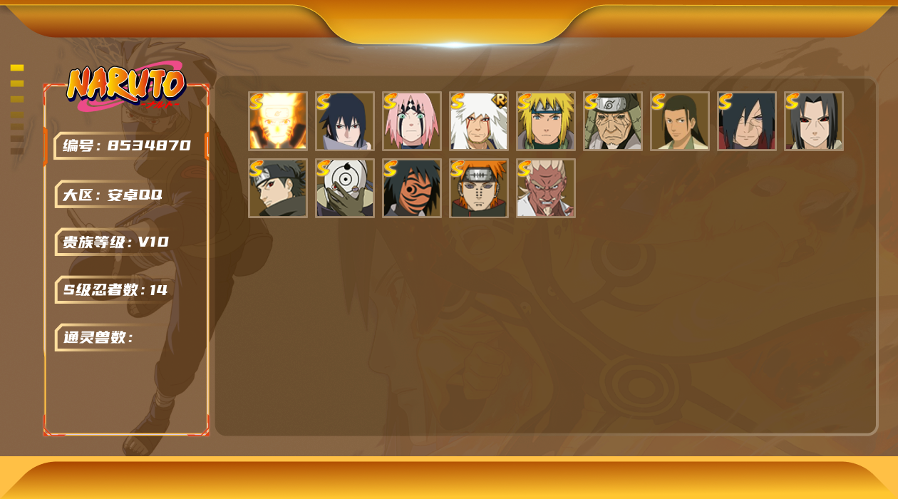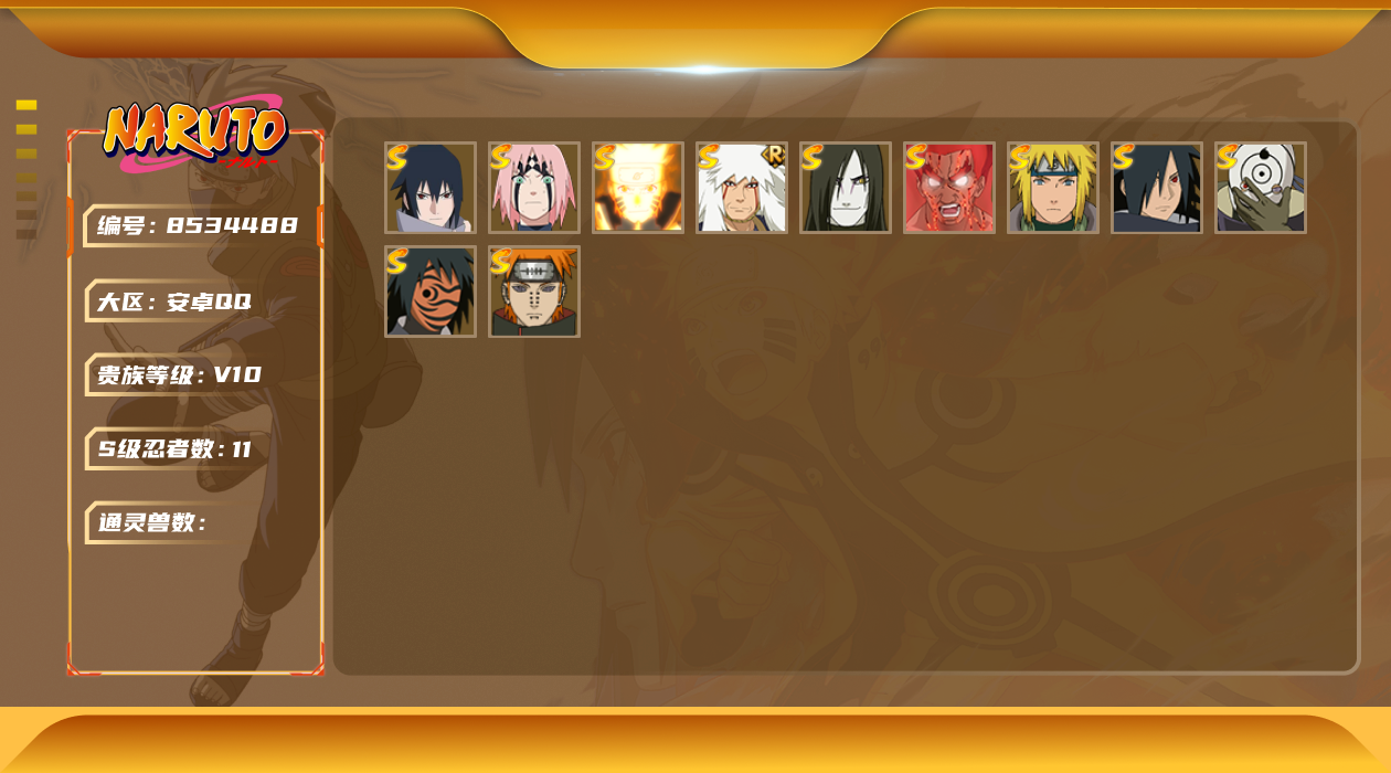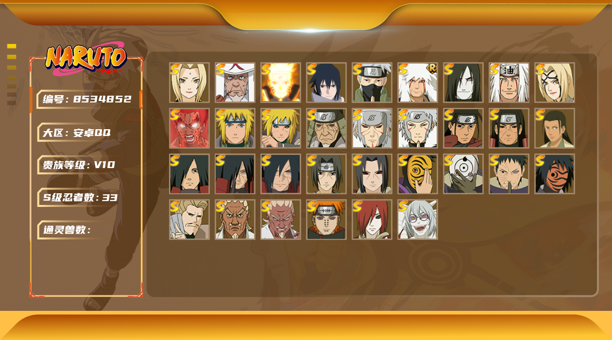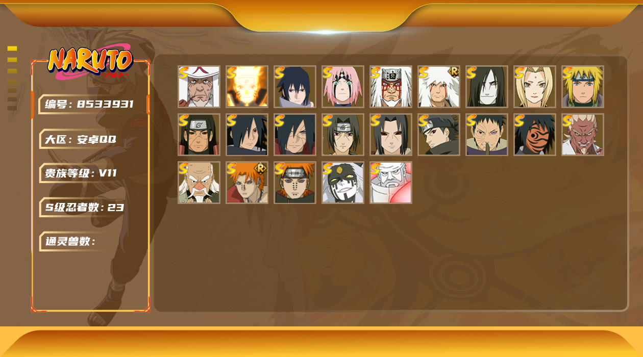 【hyn2941】v5/战力530w/s忍10/a忍27/通灵兽14/2星日向宁次「忍界大战」/2星我爱罗「疾风传」/2星飞段「死司凭血」/3星宇智波佐助「永恒万花筒」/3星宇智波鼬「秽土转生」/2星迈特凯/2星猿飞日斩「火影继承人」/2星长门「青年」/3星宇智波带土「忍界大战」/2星蝎/3星佩恩「天道」/2星照美冥「五代目水影」/3星波风水门/3星漩涡鸣人「九喇嘛连结」/2星秋道丁次「忍界大战」/2星漩涡博人「桃式显现」/2星旗木卡卡西「万花筒写轮眼」/2星长十郎「六代目水影」/2星波风水门「青年」/3星自来也「舞之豪杰」/3星迈特凯「死门」/2星迪达拉「秽土转生」/2星飞段/2星奇拉比/2星猿飞阿斯玛/2星我爱罗「忍界大战」/2星迪达拉/2星干柿鬼鲛/3星大蛇丸/3星宇智波斑「秽土转生·解」/2星艾「青年」/2星不缘/2星宇智波佐助「须佐能乎」/2星千代「近松十人卫」