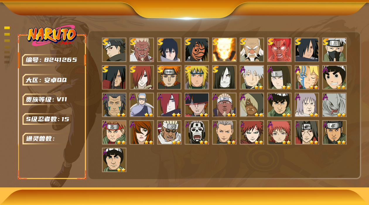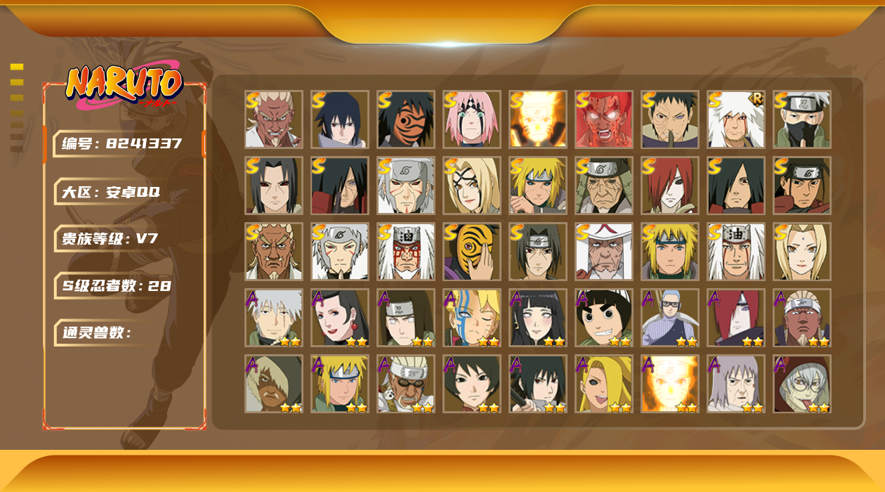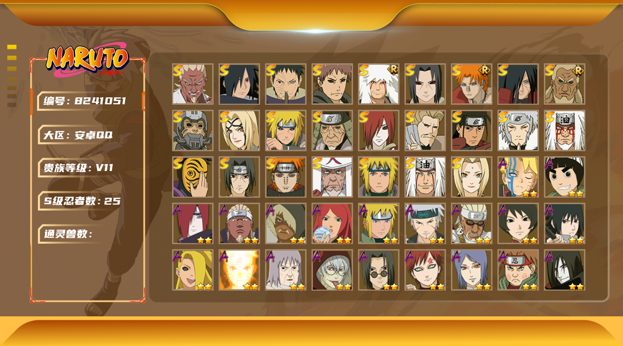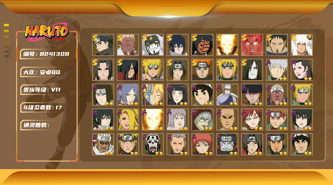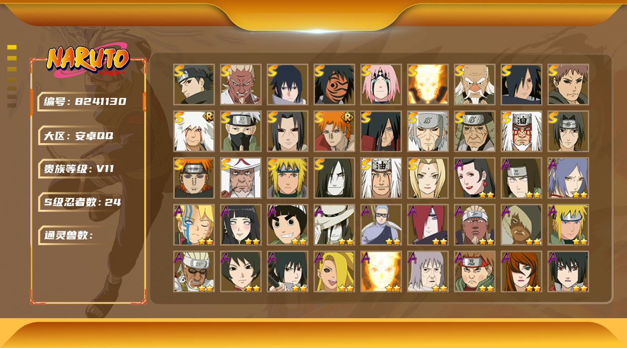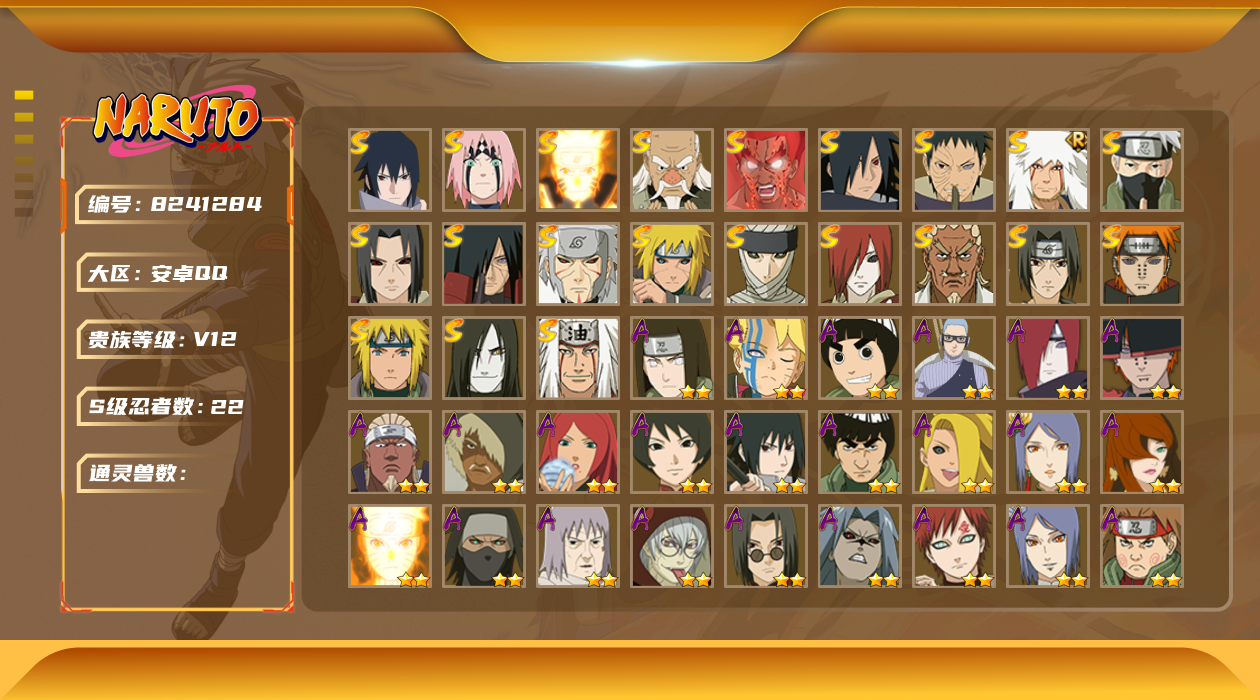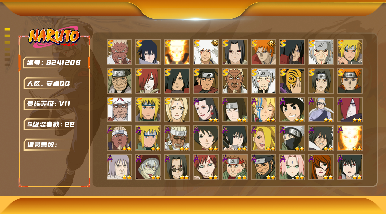[8240960]x8560战斗力:1075w;段位:中忍2阶;本服排名:328;战区排名:未上榜;vip11级;s忍21个;a忍26个;通灵兽17个;s忍:百豪纲手忍界大战艾二代目土影无4星猿飞日斩(普通)秽土转生半藏仙人模式自来也自来也(普通)秽土转生猿飞日斩三代目雷影艾须佐能乎宇智波鼬秽土转生千手扉间天道佩恩秽土转生宇智波鼬白面具宇智波斑须佐能乎旗木卡卡西神秘面具男(普通)须佐能乎宇智波止水舞之豪杰自来也千手柱间(普通)秽土转生波风水门4星纲手(普通);a忍:5星迈特凯(普通)5星猿飞阿斯玛(普通)5星蝎(普通)5星干柿鬼鲛(普通)3星疾风传我爱罗3星半蛇斗篷药师兜3星飞段(普通)3星死司凭血飞段仙人模式漩涡鸣人九尾查克拉漩涡鸣人忍界大战秋道丁次 最终章日向雏田秽土转生猿飞阿斯玛志村团藏青年波风水门忍界大战我爱罗近松十人卫千代奇拉比(普通)地怨虞角都晓大蛇丸绯流琥蝎宇智波鼬(普通)新春限定宇智波鼬迪达拉(普通)桃式显现漩涡博人四代目土影黑土;通灵兽:忍犬(普通)蓝蛇蛤蟆吉忍龟镰鼬猿魔山椒鱼蜃鲛鲨蛞蝓(普通)蛤蟆仙人蛤蟆健乌鸦(普通)蛤蟆龙蛤蟆广砂之守鹤梦貘;时装:蜀面豪杰舞之豪杰自来也;详情看图【1209区】【安卓qq】【可二次实名】