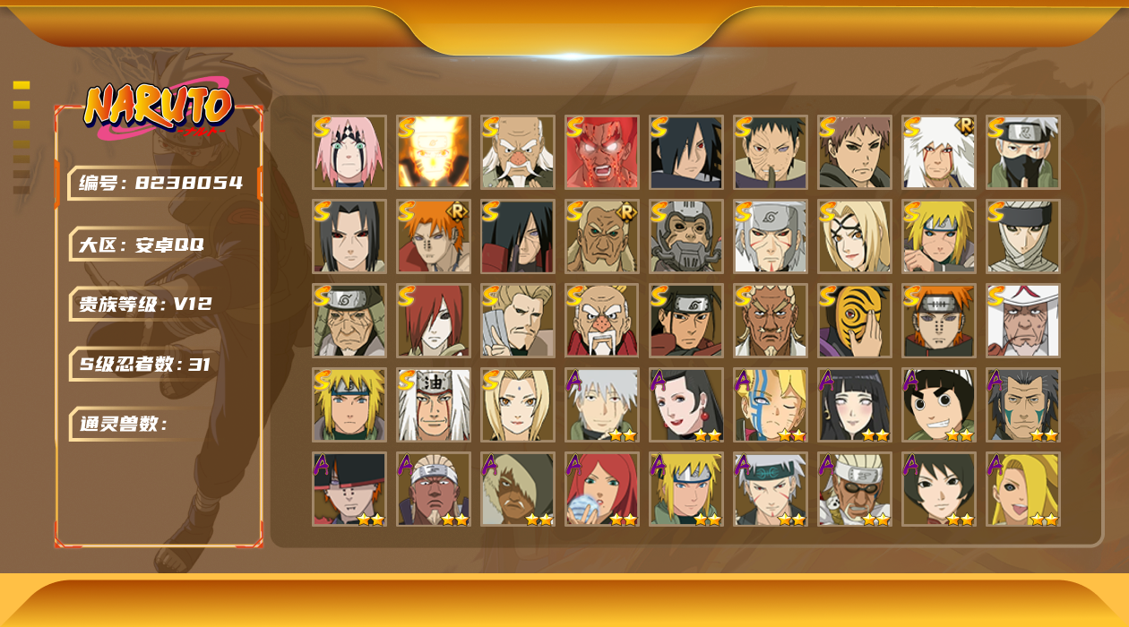 [8238054]x8722战斗力:1401w;段位:上忍1阶;本服排名:123;战区排名:未上榜;vip12级;s忍34个;a忍43个;通灵兽21个;s忍:二代目土影无自来也(普通)忍界大战大野木木叶创立宇智波斑秽土转生千手扉间白面具宇智波斑四代目风影罗砂秽土转生宇智波鼬死门迈特凯4星大蛇丸(普通)四代目雷影艾秽土转生波风水门三代目土影大野木九喇嘛连结漩涡鸣人超佩恩天道秽土转生千手柱间神秘面具男(普通)三代目雷影艾波风水门(普通)忍界大战春野樱舞之豪杰自来也4星猿飞日斩(普通)天道佩恩二代目水影鬼灯幻月4星纲手(普通)仙人模式药师兜秽土转生猿飞日斩秽土转生半藏百豪纲手秽土转生宇智波斑千手柱间(普通)秽土转生长门须佐能乎旗木卡卡西忍界大战宇智波带土;a忍:5星迈特凯(普通)5星猿飞阿斯玛(普通)5星蝎(普通)5星干柿鬼鲛(普通)4星疾风传我爱罗4星飞段(普通)4星死司凭血飞段3星须佐能乎宇智波佐助3星木叶上忍猿飞木叶丸仙人模式漩涡鸣人九尾查克拉漩涡鸣人疾风传咒印宇智波佐助百豪春野樱忍界大战秋道丁次 忍界大战李洛克最终章日向雏田幻之真容旗木卡卡西宇智波止水(普通)新春限定波风水门青年波风水门忍界大战我爱罗近松十人卫千代五代目水影照美冥奇拉比(普通)忍界大战奇拉比青年艾漂泊武士千手扉间半蛇斗篷药师兜不风不缘不动漂泊浪客佩恩六道小南(普通)夏日泳装小南绝角都(普通)宇智波鼬(普通)迪达拉(普通)秽土转生迪达拉暴怒宇智波带土五代目雷影达鲁伊桃式显现漩涡博人四代目土影黑土;通灵兽:忍犬(普通)蓝蛇蛤蟆吉忍龟镰鼬猿魔山椒鱼蜃鲛鲨熊猫蛤蟆仙人蛤蟆健蛞蝓(普通)乌鸦(普通)蛤蟆龙砂之守鹤蛤蟆广梦貘鹰蜘蛛辛牙;时装:狂野鲛鲨干柿鬼鲛百战大蛇丸蜀面豪杰舞之豪杰自来也;详情看图【1283区】【安卓qq】【可二次实名】