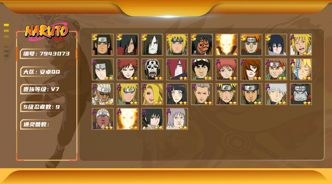 [8219448]xr37700-安卓q-区服3426-9s级忍者数-20a级忍者数-战力741w 【s级忍者】:宇智波斑「秽土转生·解」3星,宇智波带土「忍界大战」3星,艾「忍界大战」3星,旗木卡卡西「须佐能乎」3星,自来也「舞之豪杰」3星,波风水门3星,佩恩「天道」3星,宇智波佐助「永恒万花筒」3星,宇智波斑 「白面具」3星宇智波斑「白面具」 【a级忍者】:波风水门「青年」2星,迪达拉2星,迪达拉「秽土转生」2星,飞段「死司凭血」2星,干柿鬼鲛2星,漩涡博人「桃式显现」2星,漩涡鸣人「九尾查克拉」2星,迈特凯2星,我爱罗「疾风传」2星,蝎2星,角都「秽土转生」2星,猿飞阿斯玛2星,宇智波鼬2星,宇智波佐助「须佐能乎」2星,日向宁次「忍界大战」2星,长十郎「六代目水影」2星,李洛克「忍界大战」2星,秋道丁次「忍界大战」2星,千代「近松十人卫」2星,宇智波泉奈2星