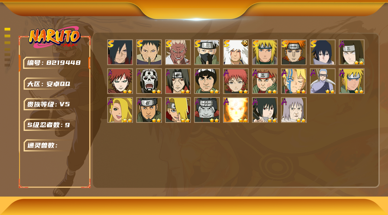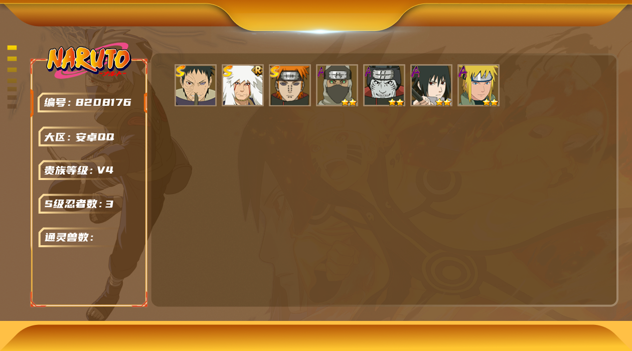 [8208176]xr36682-安q-可修改 贵族等级: v4 s忍数: 3 a忍数: 4 战力值万: 82 s级忍者: 佩恩「天道」宇智波带土 「忍界大战」自来也 「舞之豪杰」 通灵兽: 忍犬忍龟蛤蟆吉蓝蛇猿魔镰鼬山椒鱼蜃砂之守鹤
