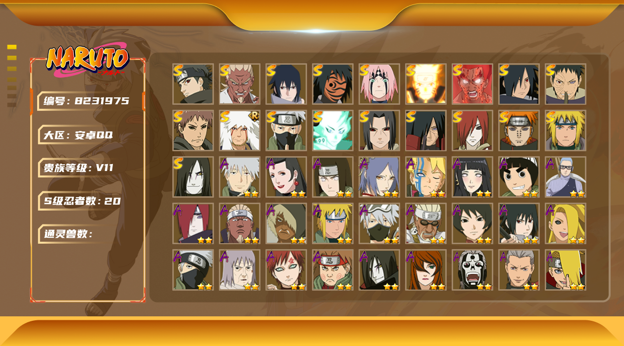 [8217386]xr37085-安q-可修改-3s级忍者数-5a级忍者数-战力146w 【s级忍者】:旗木卡卡西「须佐能乎」3星旗木卡卡西「须佐能乎」,自来也「舞之豪杰」3星自来也「舞之豪杰」,佩恩「天道」3星佩恩「天道」 【a级忍者】:迪达拉2星迪达拉,干柿鬼鲛2星干柿鬼鲛,蝎「绯流琥」2星蝎「绯流琥」,宇智波鼬2星宇智波鼬,宇智波泉奈2星宇智波泉奈