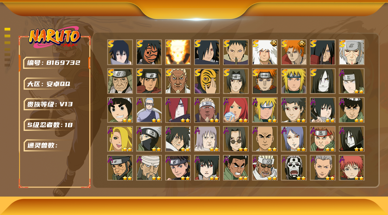 [8169995]x8528战斗力:1251w;段位:中忍2阶;本服排名:430;战区排名:未上榜;vip13级;s忍34个;a忍56个;通灵兽23个;s忍:大蛇丸(普通)猿飞日斩(普通)秽土转生解宇智波斑二代目水影鬼灯幻月千手扉间(普通)纲手(普通)仙人模式药师兜秽土转生金角银角四代目雷影艾二代目土影无秽土转生猿飞日斩白面具宇智波斑秽土转生宇智波斑秽土转生长门4星波风水门(普通)木叶创立千手柱间宇智波斑(普通)须佐能乎旗木卡卡西百豪纲手秽土转生半藏4星天道佩恩秽土转生千手柱间红夜之刃神秘面具男秽土转生波风水门秽土转生千手扉间自来也(普通)忍界大战春野樱舞之豪杰自来也仙人模式自来也千手柱间(普通)须佐能乎宇智波鼬秽土转生宇智波鼬永恒万花筒宇智波佐助神秘面具男(普通);a忍:5星迈特凯(普通)5星猿飞阿斯玛(普通)5星蝎(普通)5星干柿鬼鲛(普通)4星疾风传我爱罗4星飞段(普通)3星百豪春野樱3星忍界大战我爱罗3星死司凭血飞段仙人模式漩涡鸣人九尾查克拉漩涡鸣人万花筒写轮眼宇智波佐助须佐能乎宇智波佐助疾风传咒印宇智波佐助忍界大战秋道丁次忍界大战日向宁次忍界大战李洛克忍界大战天天最终章日向雏田万花筒写轮眼旗木卡卡西忍界大战旗木卡卡西秽土转生猿飞阿斯玛地陆宇智波止水(普通)新春限定宇智波止水志村团藏新春限定波风水门青年波风水门忍界大战勘九郎近松十人卫千代五代目水影照美冥侠隐江湖照美冥奇拉比(普通)忍界大战奇拉比侠隐江湖纲手漂泊武士千手扉间半蛇斗篷药师兜不风不缘不动青年长门漂泊浪客佩恩六道小南(普通)漂泊浪客小南晓创生角都角都(普通)地怨虞角都晓大蛇丸绯流琥蝎宇智波鼬(普通)迪达拉(普通)秽土转生迪达拉火之意志继承者卑留呼木叶上忍猿飞木叶丸六代目水影长十郎四代目土影黑土;通灵兽:忍犬(普通)蓝蛇蛤蟆吉忍龟镰鼬猿魔山椒鱼蜃鲛鲨蛤蟆仙人蛤蟆健乌鸦(普通)蛞蝓(普通)蛤蟆龙蛤蟆广怒鬼(普通)梦貘鹰砂之守鹤蛞蝓侠隐江湖熊猫螃蟹万蛇(普通);时装:百战波风水门蜀面豪杰舞之豪杰自来也;详情看图【156区】【安卓qq】【可二次实名】