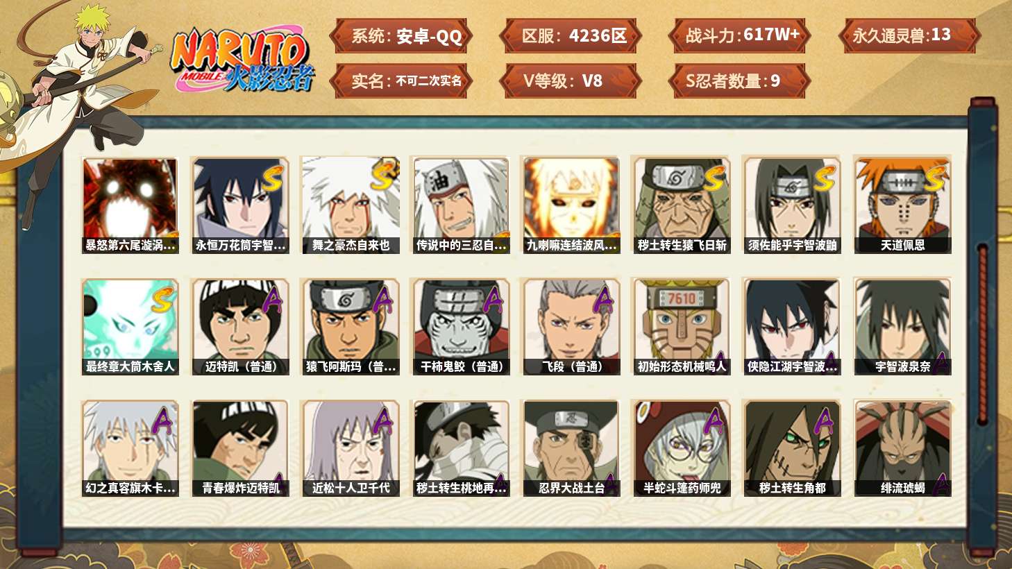 v10 29s忍 41a忍 21通灵 1651.7w战力 可二次 可修改实名 【s级忍者】:宇智波止水「须佐能乎」艾「忍界大战」宇智波斑「秽土转生·解」宇智波佐助「永恒万花筒」神秘面具男 「红夜之刃」大筒木金式「博人传」漩涡鸣人 「九喇嘛连结」迈特凯「死门」宇智波带土 「忍界大战」
