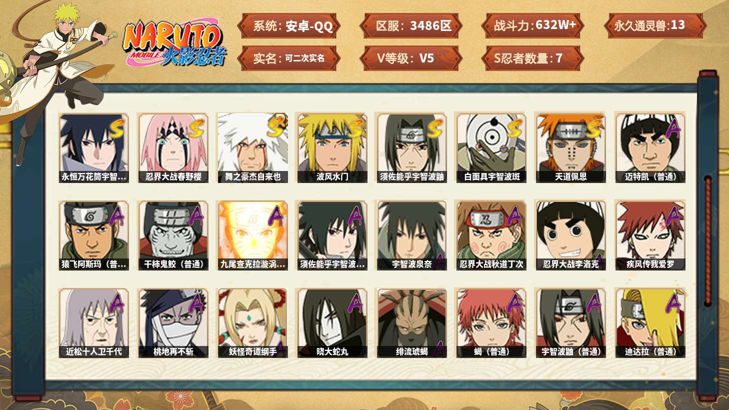 [14564922]v8 15s忍 30a忍 16通灵 1005.7w战力 可二次 可修改实名 【s级忍者】:宇智波止水「须佐能乎」宇智波斑「秽土转生·解」宇智波佐助「永恒万花筒」春野樱 「忍界大战」漩涡鸣人 「九喇嘛连结」自来也 「舞之豪杰」旗木卡卡西「须佐能乎」宇智波斑「白面具」