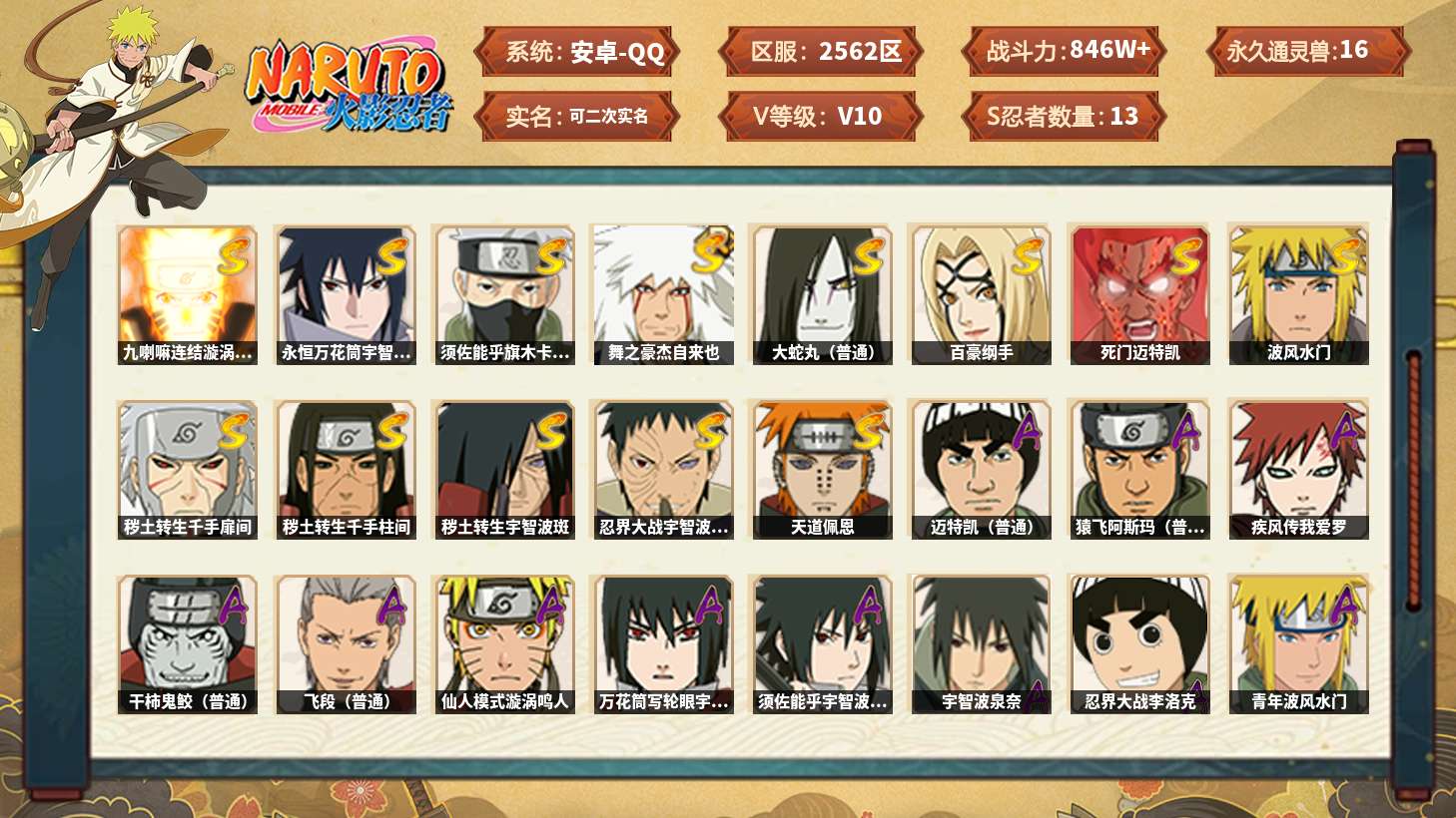 【火影忍者】【lyhy9450】战斗力:846w;段位:中忍1阶;本服排名:411;vip:v10级;s忍:13个;a忍:20个;通灵兽:16个,s忍:九喇嘛连结漩涡鸣人|永恒万花筒宇智波佐助|须佐能乎旗木卡卡西|舞之豪杰自来也|大蛇丸(普通)|百豪纲手|死门迈特凯|波风水门|秽土转生千手扉间|秽土转生千手柱间|秽土转生宇智波斑|忍界大战宇智波带土|天道佩恩__a忍:迈特凯(普通) 4星|猿飞阿斯玛(普通) 3星|疾风传我爱罗 3星|干柿鬼鲛(普通) 3星|飞段(普通) 3星|仙人模式漩涡鸣人|万花筒写轮眼宇智波佐助|须佐能乎宇智波佐助|宇智波泉奈|忍界大战李洛克|青年波风水门|奇拉比(普通)|青年艾|漂泊浪客佩恩六道|蝎(普通)|秽土转生迪达拉|死司凭血飞段|六代目水影长十郎|五代目雷影达鲁伊|四代目土影黑土__通灵兽:忍犬(普通)|蓝蛇|蛤蟆吉|砂之守鹤|忍龟|镰鼬|猿魔|山椒鱼|蛞蝓(普通)|蜃|蛤蟆仙人|鲛鲨|蛤蟆健|乌鸦(普通)|蛤蟆龙|蛤蟆广