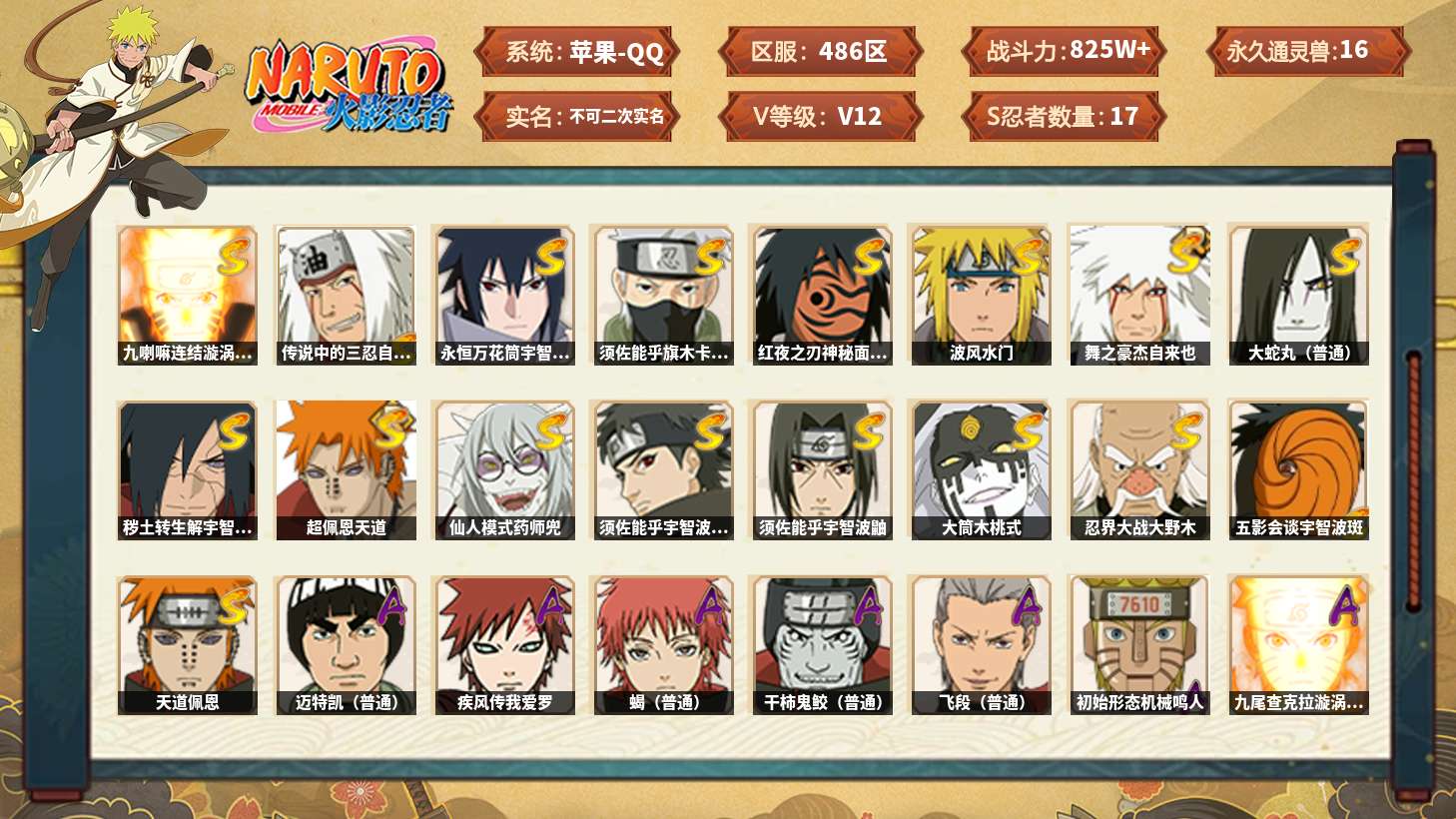 【火影忍者】【lyhy9449】战斗力:825w;段位:上忍2阶;本服排名:524;vip:v12级;s忍:17个;a忍:29个;通灵兽:16个,s忍:九喇嘛连结漩涡鸣人|传说中的三忍自来也|永恒万花筒宇智波佐助|须佐能乎旗木卡卡西|红夜之刃神秘面具男|波风水门|舞之豪杰自来也|大蛇丸(普通)|秽土转生解宇智波斑|超佩恩天道|仙人模式药师兜|须佐能乎宇智波止水|须佐能乎宇智波鼬|大筒木桃式|忍界大战大野木|五影会谈宇智波斑|天道佩恩__a忍:迈特凯(普通)|疾风传我爱罗|蝎(普通)|干柿鬼鲛(普通)|飞段(普通)|初始形态机械鸣人|九尾查克拉漩涡鸣人|须佐能乎宇智波佐助|宇智波泉奈|忍界大战秋道丁次|忍界大战日向宁次|忍界大战李洛克|最终章日向雏田|青春爆炸迈特凯|猿飞阿斯玛(普通)|青年波风水门|近松十人卫千代|五代目水影照美冥|奇拉比(普通)|青年艾|青年长门|绯流琥蝎|宇智波鼬(普通)|夏日限定宇智波鼬|迪达拉(普通)|死司凭血飞段|桃式显现漩涡博人|六代目水影长十郎|仙人模式巳月__通灵兽:忍犬(普通)|蓝蛇|蛤蟆吉|忍龟|镰鼬|猿魔|砂之守鹤|山椒鱼|蜃|蛤蟆仙人|鲛鲨|蛤蟆健|乌鸦(普通)|蛤蟆龙|蛞蝓(普通)|蛤蟆广