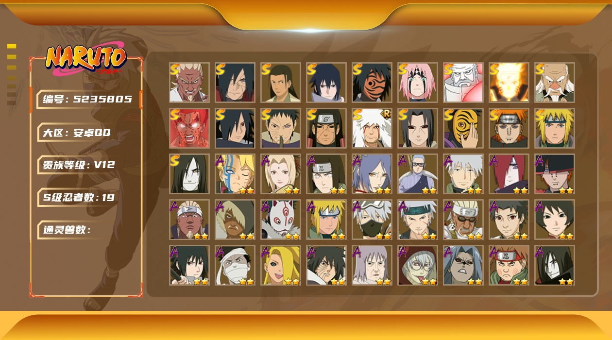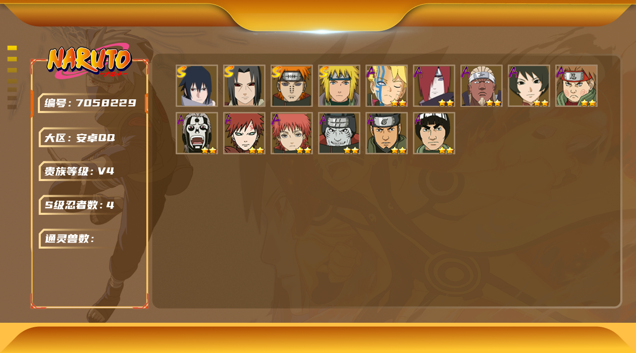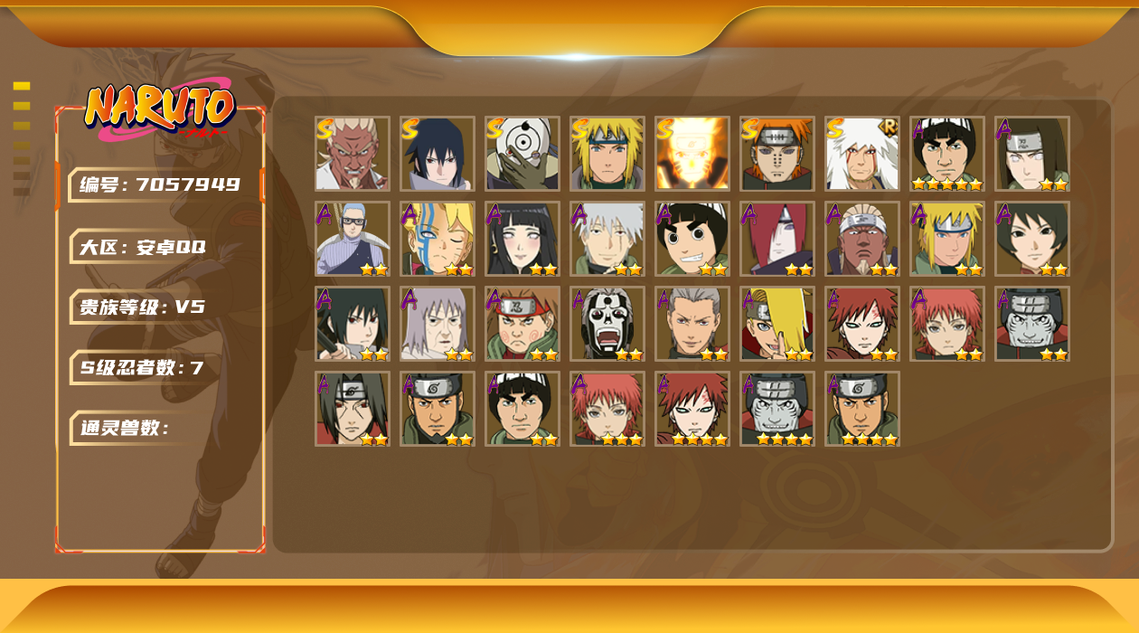 al044718 【1】 通灵数量14 游戏大区3516 vip等级【文本】8 s碎片数8 s级忍者【合计】8 a级忍者【合计】16 b级忍者【合计】34 忍者数99 区服【文本】安卓qq 实名情况【文本】可修改 【安卓qq】 【可修改】 【8】 s级忍者8 a级忍者16 b级忍者34 c级忍者41 s级忍者:秽土日斩,天道佩恩,豪杰自来也,波风水门,忍战艾,秽土解斑,桃式,永恒佐助; a级忍者:干柿鬼鲛,阿斯玛,迈特凯,「博人传」长十郎,迪达拉,宇智波鼬,「真容」卡卡西,忍战宁次,「桃显」博人,卑留呼,须佐佐助,近松十人卫_千代,忍战丁次,死司飞段,疾风我爱罗,蝎; b级忍者:最终章_奈良鹿丸,新春限定_御手洗红豆,峨眉宗师_天天,饿鬼道_佩恩,犬塚花,少年_旗木卡卡西,白,秽土转生_白,人间道_佩恩,漂泊浪客_君麻吕,新春限定_萨姆伊,红夜之刃_宇智波鼬,火之意志继承者_贰,赤土,惠比寿,卯月夕颜,疾风传_木叶丸,鬼灯水月,疾风传_手鞠,疾风传_油女志乃,疾风传_天天,疾风传_秋道丁次,暗部_宇智波鼬,疾风传_李洛克,疾风传_山中井野,疾风传_勘九郎,疾风传_宇智波佐助,疾风传_春野樱,疾风传_漩涡鸣人,漩涡玖辛奈,君麻吕,夕日红,御手洗红豆,咒印_君麻吕; c级忍者:奈良鹿丸,赛事限定_春野樱,笕堇,少年_千手扉间,漩涡鸣人,春野樱,李洛克,日向雏田,丸星古介,伊豆野山葵,结乃岩部,巳月,山城青叶,秽土转生_次郎坊,不知火玄间,青,神月出云,咒印_水木,金槌,萨克镫,忍者新秀_春野樱,忍者学员_漩涡鸣人,月光疾风,日向花火,镰多利_手鞠,多由也,左近右近,鬼童丸,次郎坊,海野伊鲁卡,写轮眼_宇智波佐助,静音,勘九郎,秋道丁次,油女志乃,手鞠,日向宁次,犬塚牙,天天,山中井野,宇智波佐助;