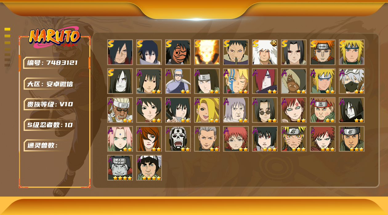 [7483121]xr36853-游戏区服:安卓微信-找回包赔-实名: 可修改 贵族等级: v10 s忍数: 10 a忍数: 28 战力值万: 822 s级忍者: 宇智波鼬「秽土转生」佩恩「天道」大蛇丸波风水门宇智波带土 「忍界大战」自来也 「舞之豪杰」漩涡鸣人 「九喇嘛连结」神秘面具男 「红夜之刃」宇智波佐助「永恒万花筒」宇智波斑「秽土转生·解」 热门a级忍者: 宇智波鼬「新春限定」波风水门「青年」 亮点: 金币14789