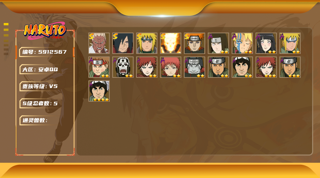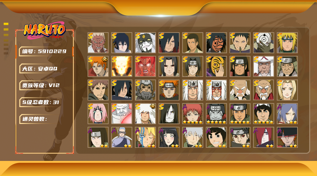 [5946326]实名: 可修改 贵族等级: v10 s忍数: 11 a忍数: 23 s级忍者: 千手柱间「秽土转生」佩恩「天道」大蛇丸波风水门大野木 「忍界大战」宇智波带土 「忍界大战」自来也 「舞之豪杰」漩涡鸣人 「九喇嘛连结」神秘面具男 「红夜之刃」宇智波佐助「永恒万花筒」旗木卡卡西「须佐能乎」 通灵兽: 忍犬忍龟蛤蟆吉蓝蛇猿魔蛞蝓蛤蟆仙人镰鼬山椒鱼蜃鲛鲨蛤蟆健乌鸦蛤蟆龙熊猫砂之守鹤