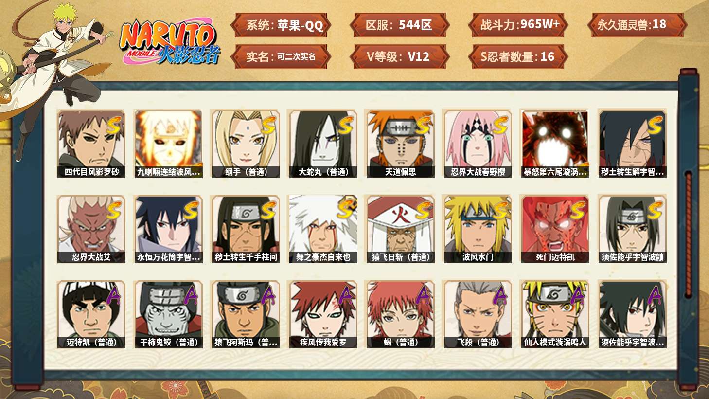 13s忍/38a忍/战力960w/v6/区服46 【s忍者】 艾「忍界大战」,宇智波斑「秽土转生·解」,宇智波佐助「永恒万花筒」,漩涡鸣人「九喇嘛连结」,自来也「舞之豪杰」,旗木卡卡西「须佐能乎」,宇智波斑「秽土转生」,神秘面具男,宇智波鼬「须佐能乎」,佩恩「天道」,波风水门,大蛇丸,波风水门「九喇嘛连结」, 【a忍者】 土台「忍界大战」,长十郎「六代目水影」,日向宁次「忍界大战」,漩涡博人「桃式