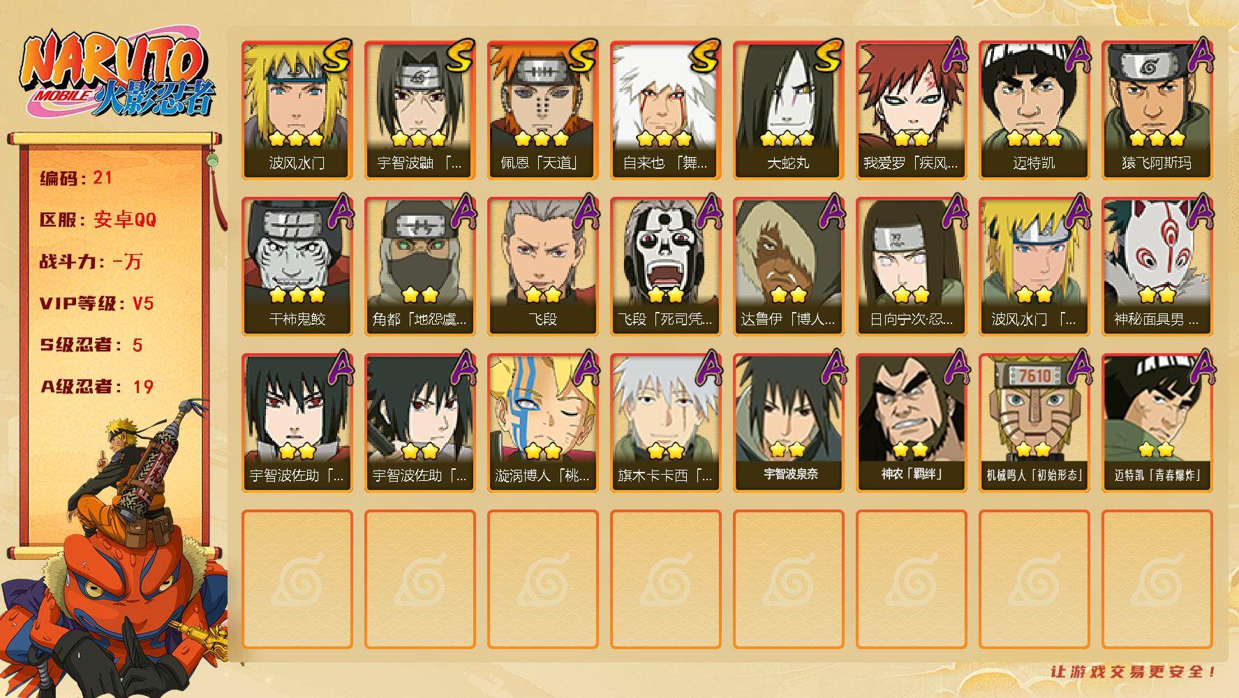 2285096-7s忍/21a忍/战力379w/v3/区服3061 【s忍者】 宇智波斑「秽土转生·解」,漩涡鸣人「九喇嘛连结」,自来也「舞之豪杰」,自来也「传说中的三忍」,宇智波鼬「须佐能乎」,佩恩「天道」,波风水门, 【a忍者】 漩涡博人「桃式显现」,旗木卡卡西「幻之真容」,李洛克「忍界大战」,蝎「绯流琥」,宇智波泉奈,神农「羁绊」,长门「青年」,艾「青年」,波风水门「青年」,漩涡鸣人「