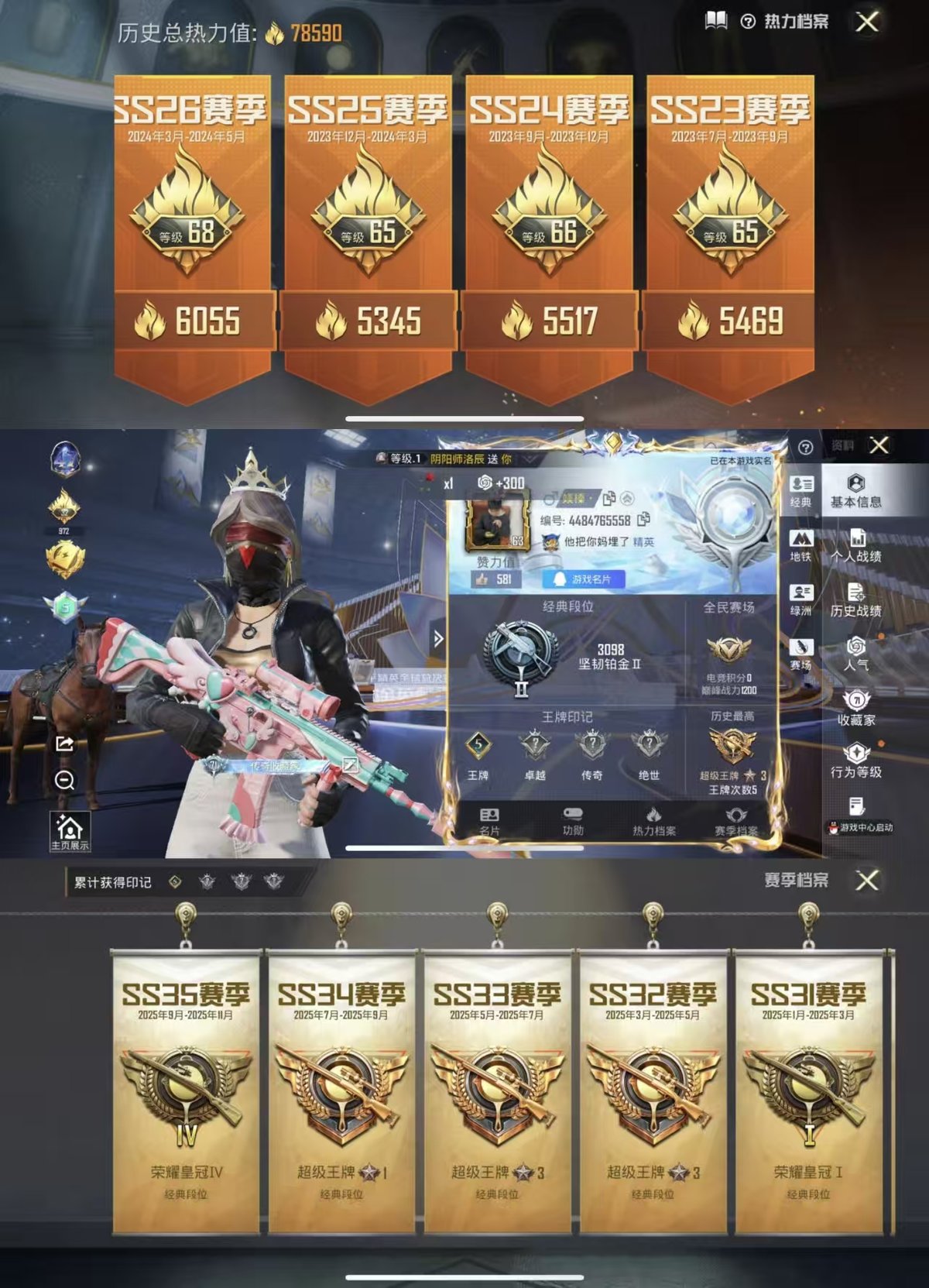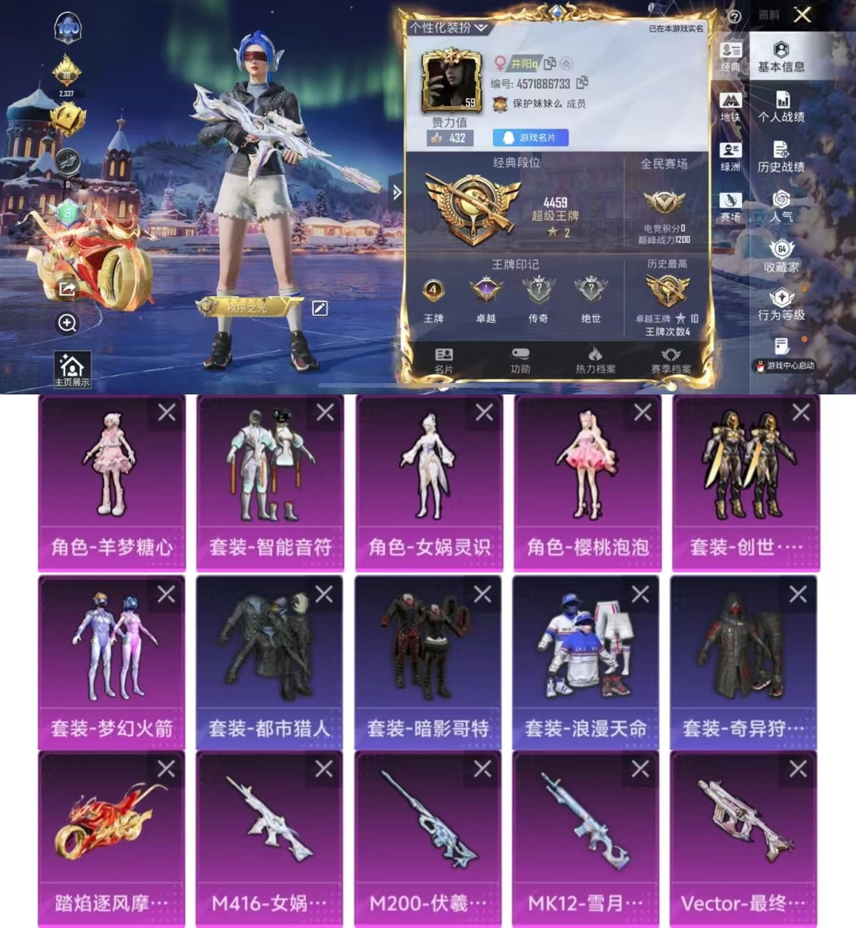 _2314704-实名:可修改时装数:595载具数:1呛械数:207战备数:143热门装扮:奇异狩猎者梦幻火箭新101鹰眼刺客智能音符都市猎人彩虹甜喵暗夜行者创世·救赎女娲灵识樱桃泡泡羊梦糖心载具:踏焰逐风摩托车稀有呛皮:kar98k-巳巳如意m416-女娲灵识m200-伏羲圣卦aug-暖羊咩咩mk12-雪月幻音vect-最终圣卫者dp-28-豹影疾电