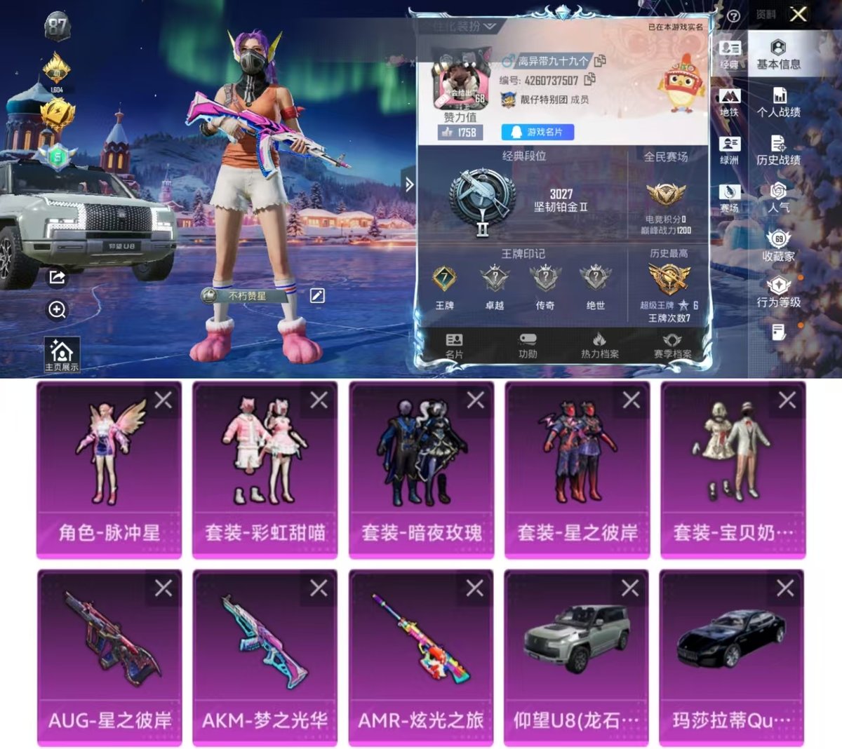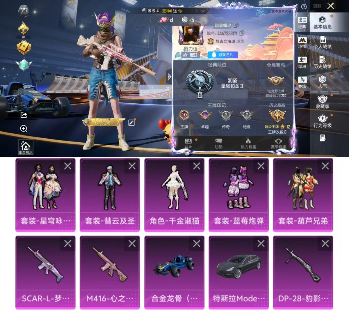 _2318661-实名:可修改时装数:651载具数:2呛械数:233战备数:144热门装扮:迅捷狂鲨彗云及圣葫芦兄弟蓝莓炮弹暴走罗小黑罗小黑软萌银虎千金淑猫星穹咏叹调载具:特斯拉model3冷光银合金龙骨(蓝)稀有呛皮:scar-l梦幻火箭m416心之恋语kar98k-巳巳如意dp-28-豹影疾电