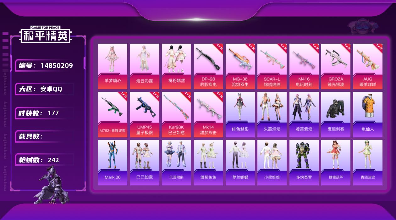 [14850209]【编号07522 可秒换绑】【店长推荐捡漏号!很多漂亮小裙子10把升级呛!!!!】 安卓 手q-3粉装-10特效呛-0载具-2粉色飞行器-66547热力值-8王牌印记-177套装-242呛皮 【热门品类】:套装-龟仙人,角色-mark.06 【粉色套装】:角色-烟云彩露,粉装-桃粉嫣然,角色-羊梦糖心 【粉色呛皮等级】:scar-l-锦绣绵绵五级,m416-电玩时刻五级,groza-镜光银凌五级,aug-暖羊咩咩五级,m762-青锋波束五级,ump45-量子极限五级,kar98k-巳巳如意五级,mk14-甜梦熊击五级,dp-28-豹影疾电五级,mg-36-沧焰双生五级 【粉色呛皮】:scar-l-锦绣绵绵,m416-电玩时刻,groza-镜光银凌,aug-暖羊咩咩,m762-青锋波束,ump45-量子极限,kar98k-巳巳如意,mk14-甜梦熊击,dp-28-豹影疾电,mg-36-沧焰双生 【粉色飞行器】:龙翔九天飞行器 【粉色降落伞】:未来歌姬降落伞,金丰海韵降落伞,鬼刀降落伞,樱桃泡泡降落伞,智耀战神降落伞,星穹咏叹调降落伞,幻彩电音降落伞,灵猫魔法师降落伞,魔童闹海 哪吒降落伞 【稀有套装】:套装-龟仙人,套装-巳巳如意,套装-乐游熊熊,套装-雏菊兔兔,套装-萝兰蝴蝶,套装-小熊娃娃,角色-多纳泰罗,套装-糖糖葫芦,套装-青团波波,套装-棉花软糖,角色-都市丽猫,套装-燕燕于飞,套装-鱼渊荷华,套装-粉恋花,套装-紫幽梦,套装-蓝冰羽,角色-猎影月神,套装-星影赞美诗,套装-彩虹兔,套装-云朵鹅,套装-雪绒豹,角色-时希公主,角色-虚空骇客,套装-朱霞炽焰,套装-凌霄紫焰,角色-绯色魅影,套装-炫彩糖果 【稀有呛皮】:aug-冰晶雪宝,akm-彩虹符号,akm-破晓战魂,akm-霓虹街区,akm-龙的传人,akm-棋盘冕主,m16a4-红色方程式,scar-l-夜灯,scar-l-炫彩节奏,scar-l-玉兔迎春,scar-l-红色方程式,m416-糯团青竹,m416-红色方程式,m416-绯红前夜,m416-蓝色火焰,m416-萌萌史莱姆,groza-彩虹符号,groza-影袭,groza-懵萌河马,aug-天降萌叽,aug-耀粉歌者,q-彩虹符号,m762-天降萌叽,m762-拳皇97,m762-云朵鹅,