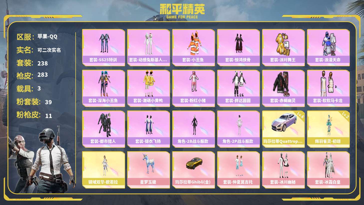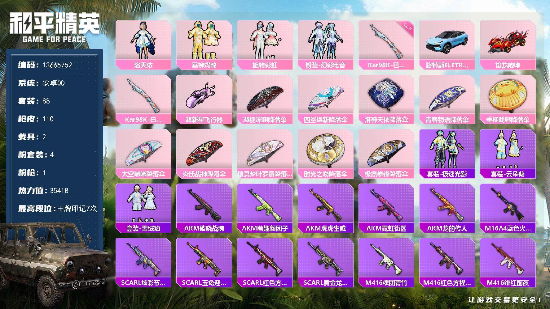 【和平精英】【lyhp16942】高印记 11w热力值 2红装39粉装11特效呛3载具 2级初翎 1级欧若拉 放客神游 雪国幻梦 千金淑猫 洛天依 第五大道 缤纷油彩 甜梦小狐 梦幻火箭 三巧克力(红熊茄茄 派对舞王 赤蝎幽灵 都市猎人 胖达圆圆 深海小丑鱼 潮萌小黄鸭)3级aug星梦奇缘 满级m4五爪金龙 满级手蕾瓶中星球 5级盐雾蛋丁香清露 6级玛莎拉蒂 星梦玉驰 39粉装,11特效呛,3载具,历史最高段位:卓越王牌16星 王牌印记14次 热力值:118732,238套装,283呛械,461装备,223战备;套装:镜域双华-欧若拉,辉羽雀灵-初翊,套装-甜心巧克力,套装-宝贝奶油派,套装-天使彩虹糖,套装-雪国幻梦,套装-梦幻火箭,套装-缤纷油彩,套装-放客神游,套装-馨动时刻,套装-冰霜白皇,套装-童趣迷兔,套装-彩虹鹿灵,套装-山涧鹿灵,角色-洛天依,角色-初号机款机体服,套装-精灵娃娃,套装-岚岚物语,套装-绒雪飘舞,套装-暖熊萌萌,套装-寒光使者,套装-甜梦小狐,套装-垂柳戏鸭,套装-灵感创作师,套装-彩虹甜喵,套装-冰川幽秘,套装-启明星,角色-小可学妹,角色-呆萌星弥,角色-白勺歌姬,套装-纯珍童话,套装-第五大道,套装-仲夏莫吉托,角色-紫钛骑兵,套装-甜心首席,角色-超弦星,角色-严莉莉,套装-星月云朵,角色-千金淑猫,套装-绯果甜心,套装-星穹咏叹调,套装-特训学院,套装-黄色伏地魔,套装-白色伏地魔,套装-黑色伏地魔,套装-竞技名士,套装-黄色名流,套装-猛禽,套装-长空猛禽,套装-漫步者,套装-海岛探路者,套装-赤蝎幽灵,套装-冷焰舞者,套装-都市猎人,套装-浪漫天命,套装-特战装甲,套装-青春校园,套装-活力之心,套装-鹰眼刺客,套装-冰冻风暴,套装-冷酷挑战者,套装-幻影武者,套装-摇滚战魂,套装-蓝彩潮人,套装-魅力单车,套装-坚韧舞者,套装-超能勇士,套装-都市魅力,套装-荣耀,套装-沙漠兵团,套装-派对舞王,套装-幻世战舞者,套装-呆萌铁蟹,套装-深海小丑鱼,套装-夏日倾情,套装-青涩时光,套装-缤纷果语,套装-滨海厨神,套装-龙魂突击队,套装-元素星魂,套装-胖达圆圆,套装-麻辣教官,套装-小丑鱼,套装-万圣娃娃,套装-粉红小猪,套装-破蛋小黄鸡,套装-鹤鸣,套装-霓虹街区,套装-罗小黑,套装-激萌罗小黑,套装-潮萌小黄鸭,套装-萌黄之夏,套装-动感兔斯基人偶服,套装-探宝勇士,套装-辉星之火,套装-战术大师,套装-曼妙人鱼,套装-热情海星,套装-纯真浪花,套装-天籁歌者,套装-电音精灵,角色-明日香款战斗服,角色-薰款战斗服,套装-诡夜天鹅,套装-魔力冰咖,套装-兔兔白日梦,套装-ss20特训,套装-粉团憨憨,套装-软羊咩咩,套装-奶芙汪汪,套装-恶魔喵喵,套装-银碳小老虎,套装-夏雨游龙,套装-红熊茄茄,套装-灵幻魔术师,套装-灵动马戏师,套装-俏皮奶喵,套装-暖心橘喵,套装-奶油香芋,套装-光之冒险,套装-绯格组合,套装-ss23特训,套装-银月精灵,套装-莱茵河畔,套装-香榭午后,套装-白兰地假日,套装-霓彩缤纷,套装-甜梦熊熊,套装-神气柴柴,套装-懵萌河马,套装-灵蜜圈圈,套装-妙红点点,套装-幻彩翩翩,套装-跃动晴空,套装-活力清阳,套装-银杏天影,套装-王牌教练,套装-柠萌假日,套装-青玉碎影,套装-ss24特训,套装-闪耀新星,套装-梦幻玩咖,套装-软软马卡龙,套装-青芒树下,套装-恋恋初桃,角色-短笛,套装-龟仙人,套装-涂山之恋,套装-ss25特训,套装-惊鸿侠骨,套装-锦衣飞扬,套装-诗意画廊,套装-香桃花海,套装-潮酷猛小鳄,套装-深海梦境,套装-甜蜜旋律,角色-2b战斗服款,角色-2p战斗服款,套装-龙的传人,套装-冰河战士,套装-ss26特训,套装-快闪甜心,套装-春光漫游,套装-空岛之星,角色-舰行太空,套装-傲娇队长,套装-云魄琉璃,套装-贝斯之夜,套装-焰鹰斗篷,套装-幽夜迷踪,套装-幻羽潜行,套装-ss27特训,套装-恋语绒绒,套装-老实芭蕉,套装-ss28特训,套装-奶油梦幻熊,角色-多纳泰罗,套装-童心宝龙,角色-极地流光,角色-粉雾星云,角色-冰公主,角色-mark.06,套装-街头风暴,套装-海盐绵绵冰,套装-蝶变,套装-小熊娃娃,套装-ss29特训,套装-雏菊兔兔,套装-萝兰蝴蝶,套装-异域银装,角色-摩登魅猫,角色-都市丽猫,套装-星途旅人,角色-俏兔智灵,套装-ss30特训,套装-青团波波,套装-棉花软糖,套装-糖糖葫芦,套装-果冻柠檬,套装-纯白跃动,套装-小鸟芋圆,套装-绒宝小鹅,套装-ss31特训,套装-鱼渊荷华,套装-燕燕于飞,套装-智谋强哥,套装-晶灵使者,角色-瑰梦爱神,套装-紫幽梦,套装-粉恋花,套装-晶辉守护,套装-ss33特训,套装-云朵鹅,玩偶服-小狗蛇点点,套装-巳巳如意,套装-ss32特训,套装-蓝冰羽,套装-顶瓜瓜,套装-雪绒豹,套装-大橘大利,套装-圣穹绘梦,套装-极速光影,角色-鲛海歌灵,套装-炫彩糖果,套装-星影赞美诗,套装-元气之梦,套装-ss34特训,套装-擎苍青焰,套装-朱霞炽焰,套装-凌霄紫焰,套装-薄荷星砂,套装-ss35特训,套装-午间小调,套装-秘语星愿,套装-风迹短诗,套装-粉黛兰香,套装-ss36特训,套装-萌鸡速递;呛皮:mk47-洛神天依,mk47-乌木金纹,mk47-妙红点点,mk47-风迹短诗,g36c-懵萌河马,g36c-镜域双华,g36c-星穹咏叹调,groza-影袭,groza-林间仙鹿,groza-甜蜜草莓,groza-懵萌河马,groza-2b战斗服款,groza-奶油梦幻熊,groza-海盐豹豹,7级m416-五爪金龙,5级m416-电玩时刻,m416-蓝色火焰,m416-绯红前夜,m416-糯团青竹,m416-绿野极光,蜜獾-垂柳戏鸭,蜜獾-千面幻镜,蜜獾-天降萌叽,蜜獾-精灵梦叶罗丽,蜜獾-糖糖葫芦,蜜獾-风迹短诗,蜜獾-乌木金纹,3级aug-星梦奇缘,aug-甜蜜菠萝,aug-耀粉歌者,aug-冰川粉黛,aug-海螺星光,aug-天