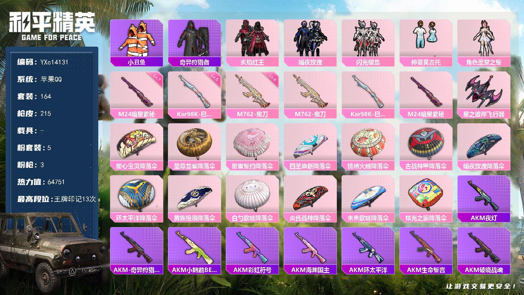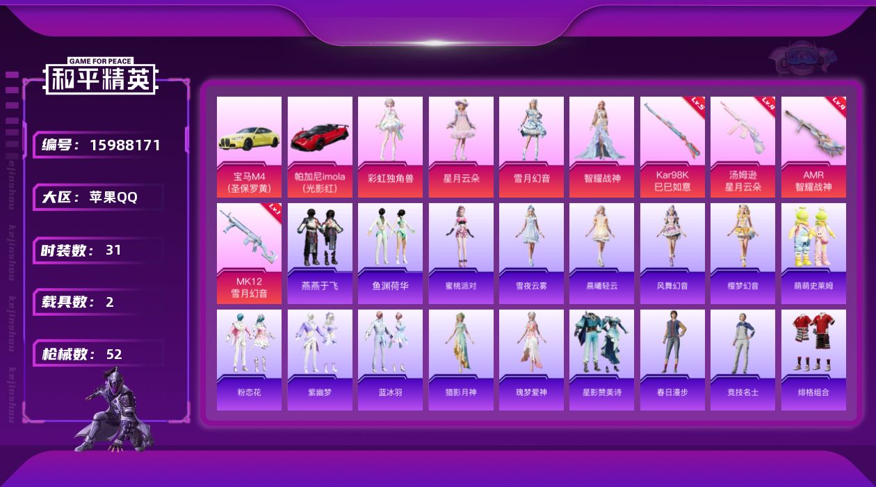 [15988167]h12520苹果q区-2粉装-3特效呛-35627热力值-7王牌印记-108套装-128呛皮【优质套装】: 异瞳寒姬 幻影战神【优质载具皮肤】 宝马m4圣保罗黄【特效呛等级】:kar98k-巳巳如意五级kar98k-巳巳如意【优质武器皮肤】: kar98k-巳巳如意【稀有武器皮肤】: dbs-乌木金纹 ac-val-兔兔小魔女 scar-l-海盐豹豹 kar98k-巳巳如意 野牛-雏菊兔兔 mk14-冰河战士 平底锅-雏菊兔兔 m762-雏菊兔兔 mini14-雏菊兔兔 famas-突变脉冲 vect-突变脉冲 r1895-雏菊兔兔 m249-金丰海韵 uzi-冰河战士 m16a4-冰河战士 mk20-h-乌木金纹 蜜獾-乌木金纹 pkm-啾咪啾咪 m416-红色方程式 m416-蓝色火焰 akm-影袭 akm-缤纷海域 akm-破晓战魂 scar-l-夜灯 scar-l-炫彩节奏 m16a4-幻世战舞者 groza-影袭 groza-生命誓言 aug-耀粉歌者 aug-天降萌叽 q-彩虹符号 m762-天降萌叽 mk47-炫光之旅 蜜獾-天降萌叽 kar98k-影袭 m24-影袭 awm-天降萌叽 awm-黄金龙骨 莫辛纳甘-乌木金纹 sks-炫彩节奏 vss-彩虹符号 mini14-耀粉歌者