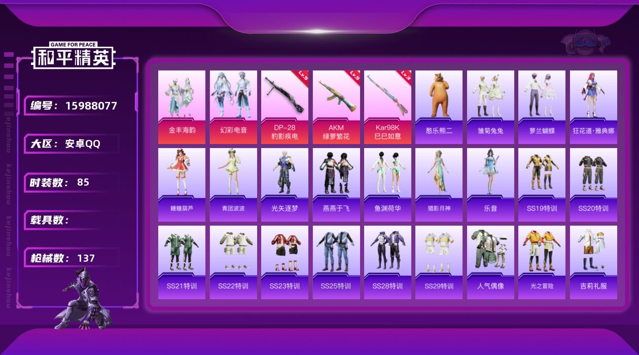 [15988077]安卓 【小号 金丰海韵 幻彩电音】 手q-2粉装-3特效呛-0载具-1粉色飞行器-34112热力值-3王牌印记-85套装-137呛皮 【粉色套装】:粉装-金丰海韵,粉装-幻彩电音 【粉色呛皮等级】:akm-绿萝繁花五级,kar98k-巳巳如意三级,dp-28-豹影疾电五级 【粉色呛皮】:akm-绿萝繁花,kar98k-巳巳如意,dp-28-豹影疾电 【粉色降落伞】:环太平洋降落伞,金丰海韵降落伞,拳皇·狂花道降落伞,千金淑猫降落伞,炫彩糖果降落伞 【稀有套装】:玩偶服-憨乐熊二,套装-炫彩糖果,套装-雏菊兔兔,套装-萝兰蝴蝶,角色-狂花道·雅典娜,套装-糖糖葫芦,套装-青团波波,角色-光矢逐梦,套装-燕燕于飞,套装-鱼渊荷华,角色-猎影月神,角色-乐音 【稀有呛皮】:aug-冰晶雪宝,akm-破晓战魂,akm-龙的传人,m16a4-幻世战舞者,m16a4-甜心亚梦,m16a4-千金淑猫,scar-l-暗夜玫瑰,scar-l-玉兔迎春,scar-l-红色方程式,scar-l-青丘仙客,m416-红色方程式,m416-蓝色火焰,groza-彩虹符号,aug-耀粉歌者,q-彩虹符号,m762-天降萌叽,m762-彩虹甜喵,m762-彩虹符号,g36c-暗夜玫瑰,ac-val-天降萌叽,ac-val-甜心亚梦,ac-val-时光之吻,蜜獾-天降萌叽,蜜獾-娇憨猪猪,uzi-娇憨猪猪,uzi-魔药课室,ump45-夜灯,ump45-涂山之恋,ump45-蓝色火焰,vect-生命誓言,汤姆逊-天降萌叽,kar98k-彩虹符号,m24-炫彩节奏,m24-樱桃泡泡,awm-垂柳戏鸭,sks-炫彩节奏,vss-彩虹符号,mini14-耀粉歌者,slr-娇憨猪猪,m417-惊鸿侠骨,mk20-h-樱桃泡泡,m200-惊鸿侠骨,s686-千金淑猫,s1897-炫彩节奏,s12k-玩趣呆呆,s12k-娇憨猪猪,s12k-幻世战舞者,s12k-极意拳锋,dbs-彩虹甜喵,dbs-彩虹符号,dbs-甜心亚梦,m249-彩虹符号,m249-糯团青竹,dp-28-彩虹符号,dp-28-甜心亚梦,mg3-幻世战舞者,mg3-惊鸿侠骨,mg3-智耀战神,蝎式手呛-闲梦青缨,蝎式手呛-千金淑猫,爆炸猎弓-惊鸿侠骨,平底锅-绝色倾城 【其他套装】:套装-ss19特训,套装-ss20