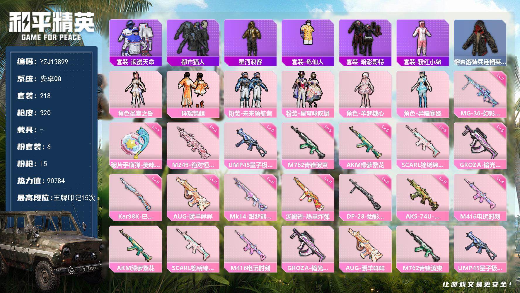 yzj13899 可二次 安卓q-2稀有6粉装14特效呛15热门 极品身法小号 地铁满天赋 (多款不重复满级特效) 都市 兔兔 申公豹 jde战队服 红眼罩 星河浪客 m4电玩4级 ak繁花满级 aug咩咩满级 手蕾满级 小熊背包 218套装320呛皮 90784热力值 15印记 历史传奇王牌17星 【2稀有】 都市猎人 浪漫天命 【6粉装】 圣堂之誓 异瞳寒姬 星穹咏叹调 未来领航者 羊梦糖