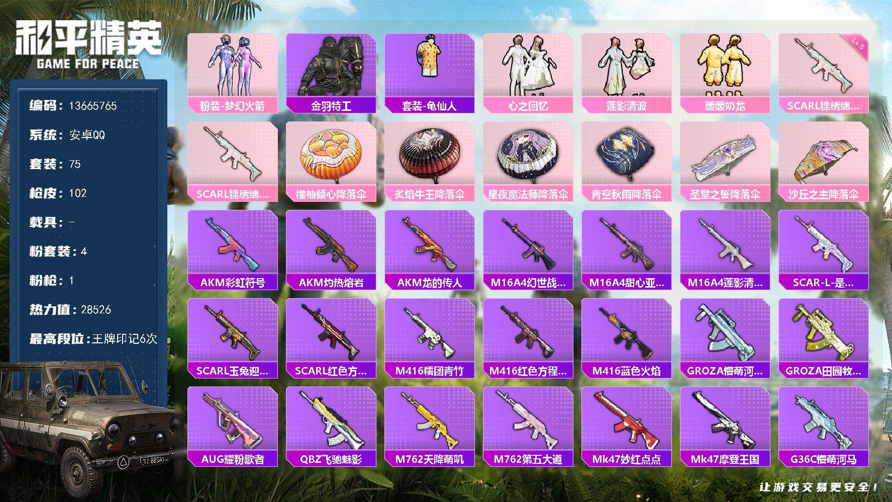 6155-4粉装-1特效呛-0载具-0粉色飞行器-28526热力值-6王牌印记-75套装-102呛皮 【热门品类】:粉装-梦幻火箭,套装-金羽特工,套装-龟仙人 【粉色套装】:粉装-梦幻火箭,粉装-心之回忆,粉装-莲影清波,粉装-暖暖奶龙 【粉色呛皮等级】:scar-l-锦绣绵绵五级 【粉色呛皮】:scar-l-锦绣绵绵 【粉色降落伞】:橘柚倾心降落伞,炙焰牛王降落伞,星夜魔法师降落伞