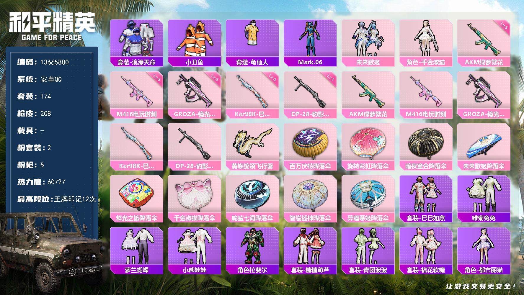 6293 2粉装-5特效呛-0载具-1粉色飞行器-60727热力值-12王牌印记-174套装-208呛皮 【热门品类】:套装-小丑鱼,套装-浪漫天命,套装-龟仙人,角色-mark.06 【粉色套装】:粉装-未来歌姬,角色-千金淑猫 【粉色呛皮等级】:akm-绿萝繁花五级 【粉色呛皮】:akm-绿萝繁花,m416-电玩时刻,groza-镜光银凌,kar98k-巳巳如意,dp-28-豹影疾