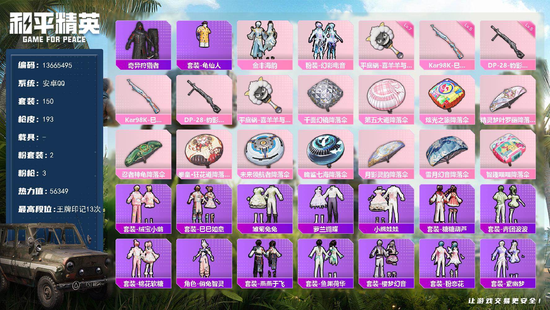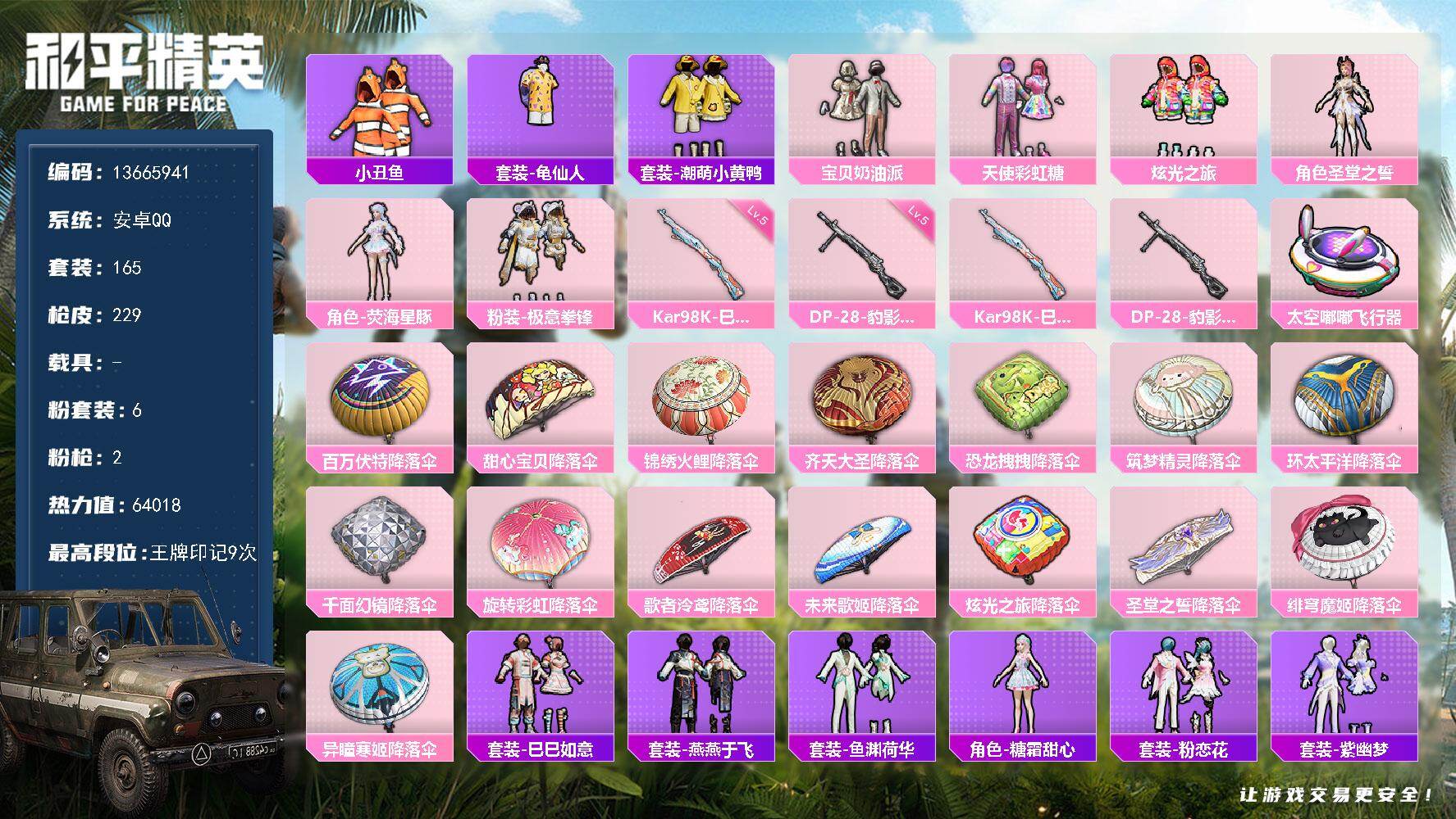 6353 6粉装-2特效呛-2粉色飞行器-64018热力值-9王牌印记-165套装-229呛皮 【热门品类】:套装-小丑鱼,套装-龟仙人,套装-潮萌小黄鸭 【粉色套装】:粉装-宝贝奶油派,粉装-天使彩虹糖,粉装-炫光之旅,角色-圣堂之誓,角色-荧海星豚,粉装-极意拳锋 【粉色呛皮】:kar98k-巳巳如意,dp-28-豹影疾电 【粉色飞行器】:太空嘟嘟飞行器 【粉色降落伞】:百万伏特降落伞