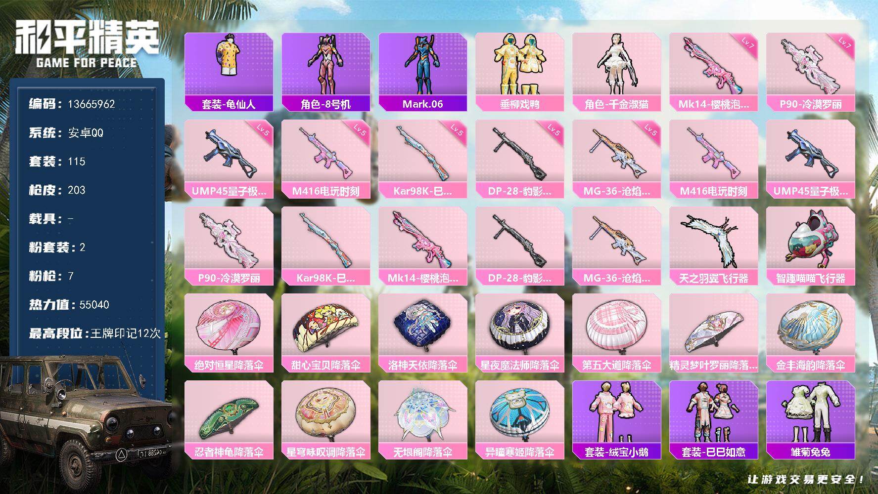 6374 【2假螳螂2粉装7特效呛3粉色飞行器】55040热力值-12王牌印记-115套装-203呛皮 【热门品类】:套装-龟仙人,角色-8号机,角色-mark.06 【粉色套装】:粉装-垂柳戏鸭,角色-千金淑猫 【粉色呛皮等级】:ump45-量子极限五级,p90-冷漠罗丽七级,mk14-樱桃泡泡七级 【粉色呛皮】:m416-电玩时刻,ump45-量子极限,p90-冷漠罗丽,k