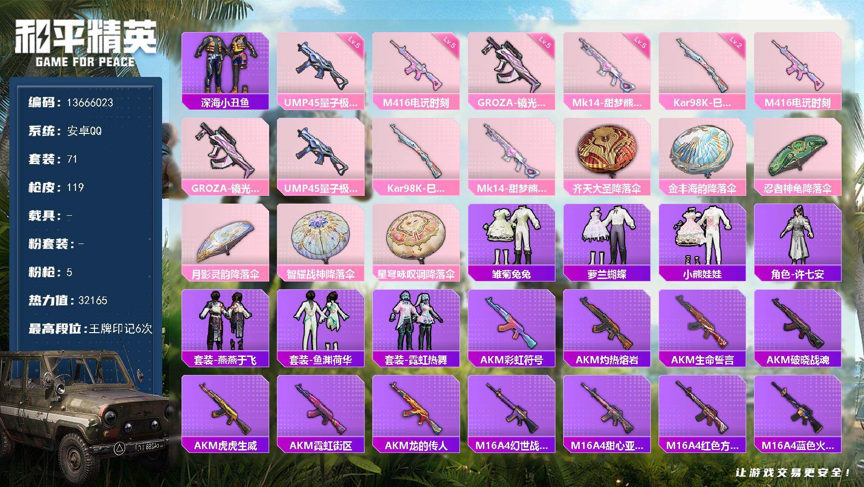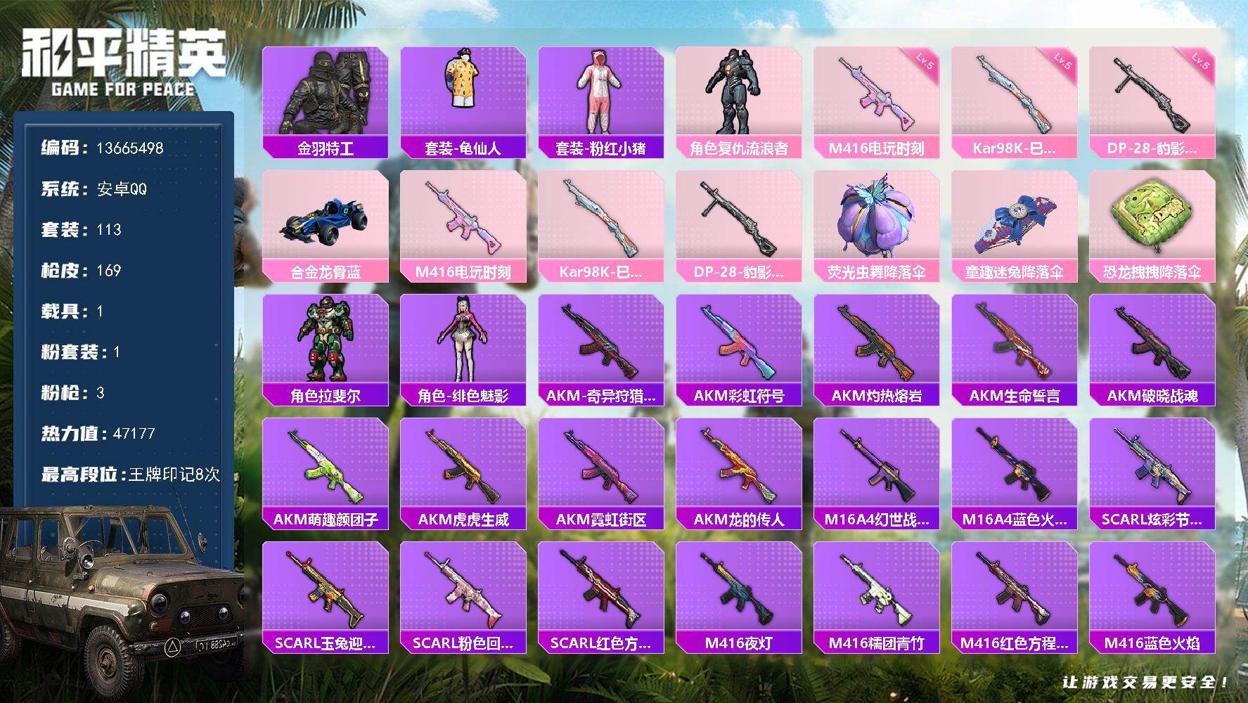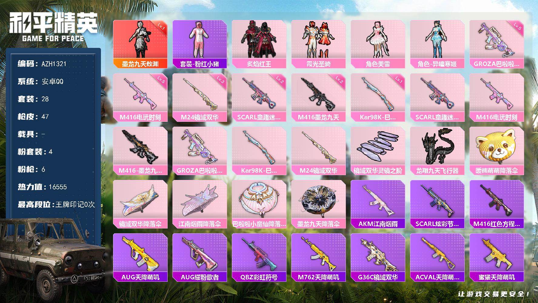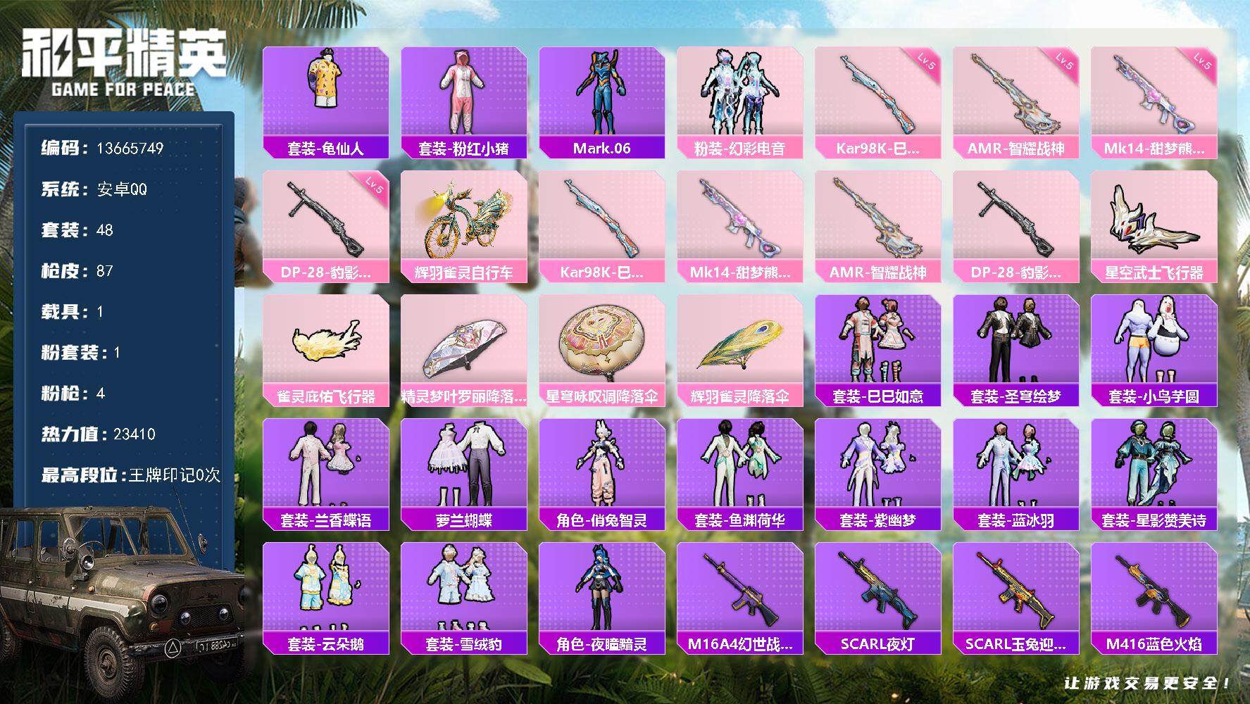 6161-1粉装-4特效呛-1载具-2粉色飞行器-23410热力值-2王牌印记-48套装-87呛皮 【热门品类】:套装-龟仙人,套装-粉红小猪,角色-mark.06 【粉色套装】:粉装-幻彩电音 【粉色呛皮等级】:kar98k-巳巳如意五级,mk14-甜梦熊击五级,amr-智耀战神五级,dp-28-豹影疾电五级 【粉色载具】:辉羽雀灵自行车 【粉色呛皮】:kar98k-巳巳