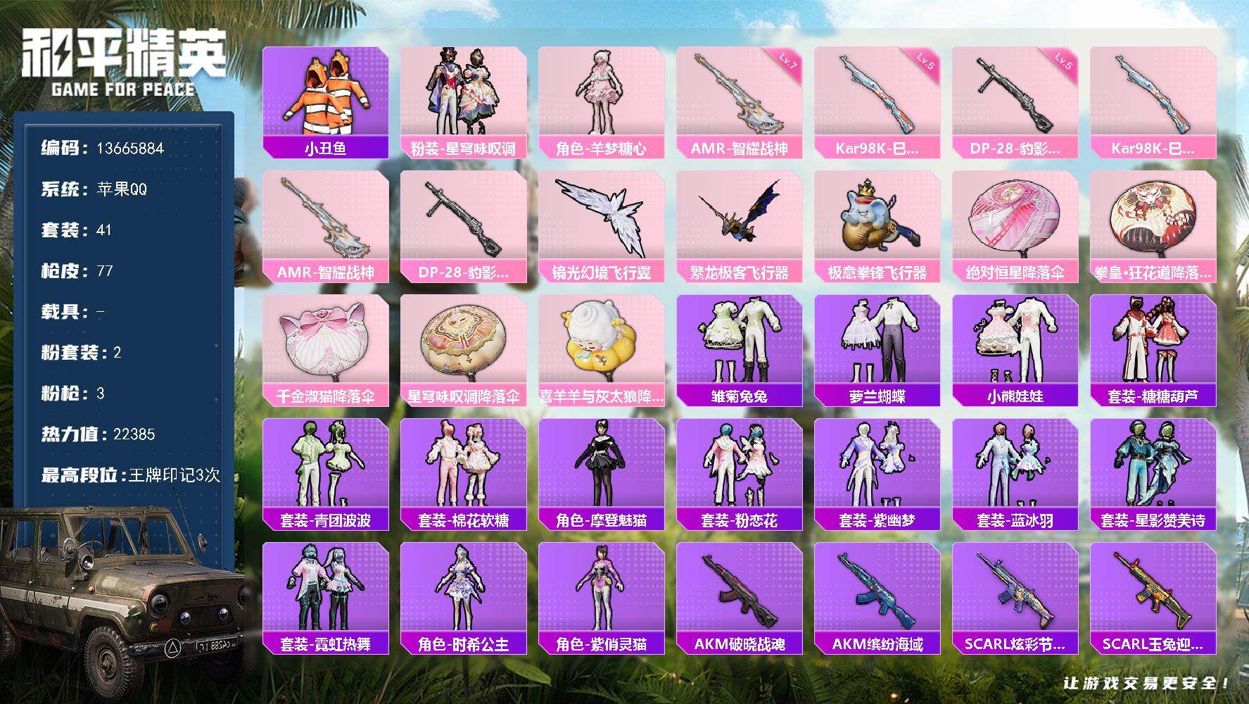 6297 2粉装-3特效呛-0载具-4粉色飞行器-22385热力值-3王牌印记-41套装-77呛皮 【热门品类】:套装-小丑鱼 【粉色套装】:粉装-星穹咏叹调,角色-羊梦糖心 【粉色呛皮等级】:amr-智耀战神七级 【粉色呛皮】:kar98k-巳巳如意,amr-智耀战神,dp-28-豹影疾电 【粉色飞行器】:繁龙极客飞行器,镜光幻境飞行翼,极意拳锋飞行器 【粉色降落伞】:绝对恒星降落伞