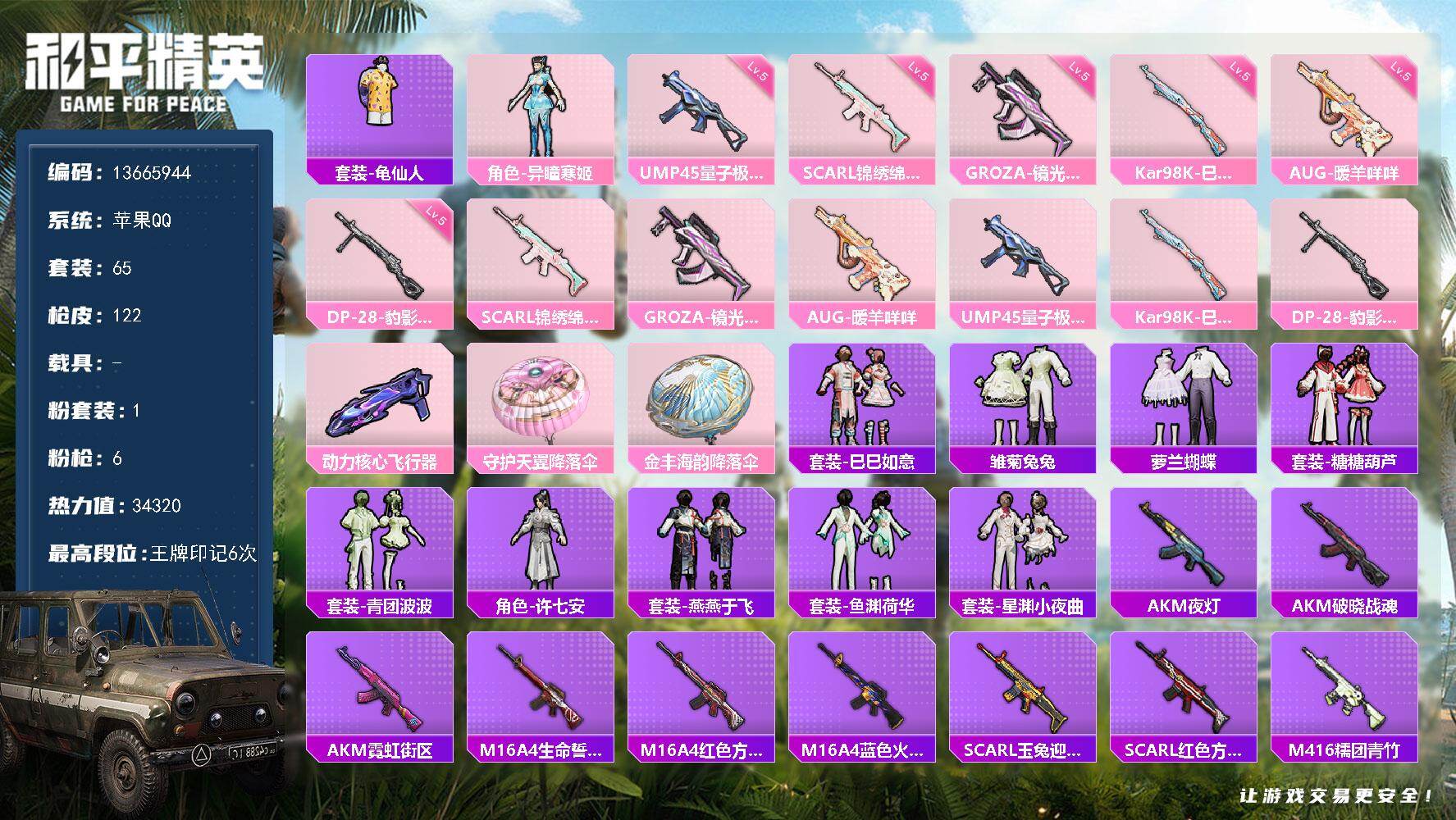 6356 1粉装-6特效呛-2粉色飞行器-34320热力值-6王牌印记-65套装-122呛皮 【热门品类】:套装-龟仙人 【粉色套装】:角色-异瞳寒姬 【粉色呛皮等级】:ump45-量子极限五级 【粉色呛皮】:scar-l-锦绣绵绵,groza-镜光银凌,aug-暖羊咩咩,ump45-量子极限,kar98k-巳巳如意,dp-28-豹影疾电 【粉色飞行器】:动力核心飞行器 【粉色降落伞】