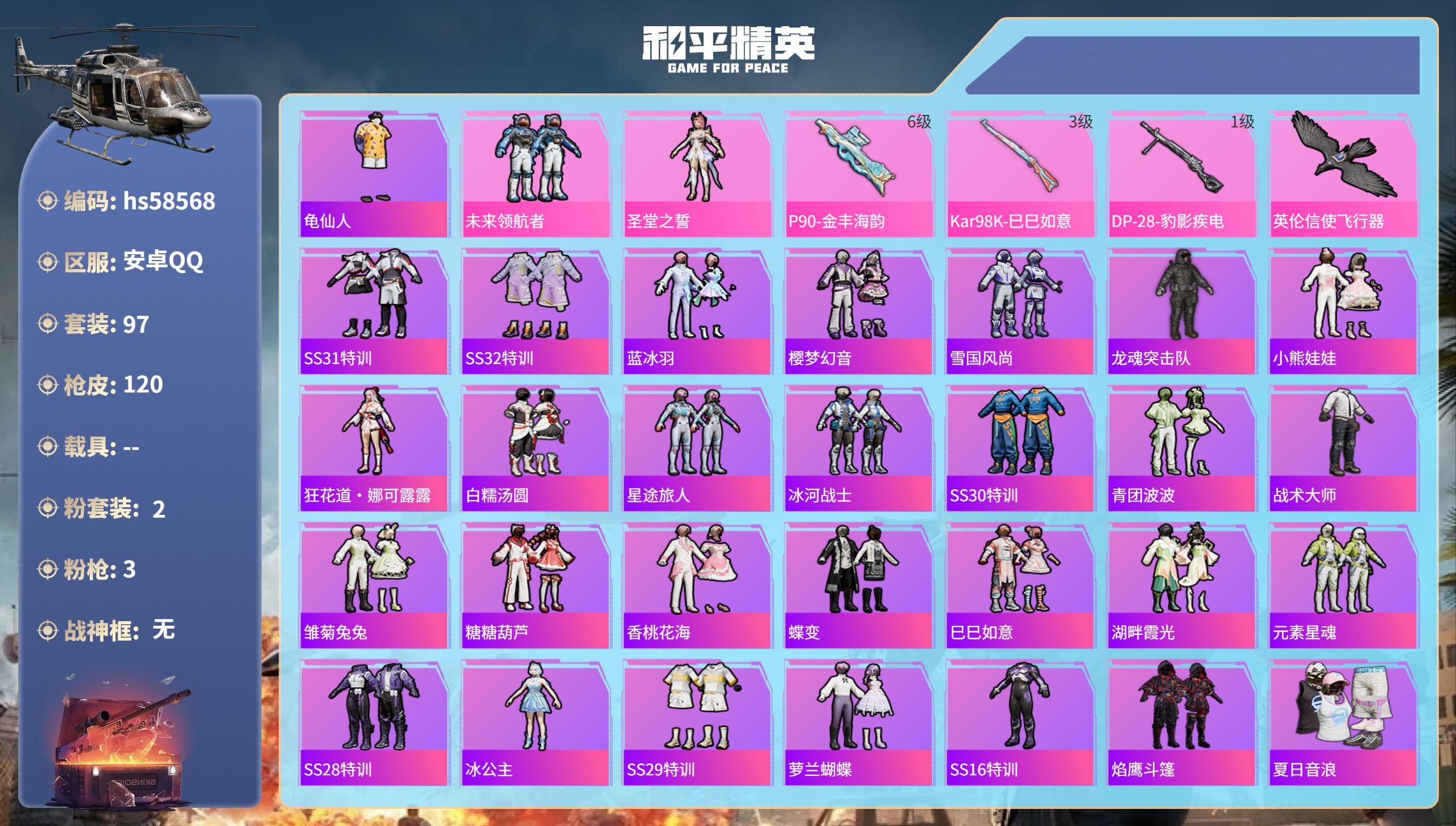 6077-1粉装-2特效呛-1载具-2粉色飞行器-32648热力值-7王牌印记-100套装-118呛皮 【热门品类】:套装-龟仙人 【粉色载具】:玛莎拉蒂quattropte(夜幕蓝) 【粉色套装】:粉装-霓裳武神 【粉色呛皮等级】:kar98k-巳巳如意五级,dp-28-豹影疾电五级 【粉色呛皮】:kar98k-巳巳如意,dp-28-豹影疾电 【粉色飞行器】:太空嘟嘟飞行器