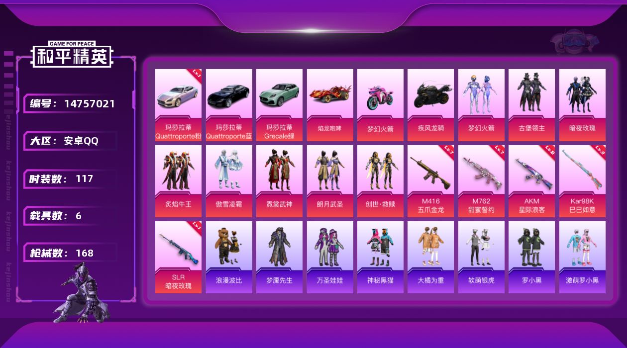 [14757021]【mhlm2732】安卓 手q-8粉装-5特效呛-6载具-5粉色飞行器-65034热力值-2王牌印记-117套装-168呛皮 【红色载具】:玛莎拉蒂quattropte(幻星粉)一级 【热门品类】:粉装-梦幻火箭,套装-忍者信条,套装-龟仙人,套装-暗影哥特,套装-浪漫波比 【粉色套装】:粉装-梦幻火箭,粉装-古堡领主,粉装-暗夜玫瑰,粉装-炙焰牛王,粉装-傲雪凌霜,粉装-霓裳武神,粉装-朗月武圣,套装-创世·救赎 【粉色呛皮等级】:akm-星际浪客六级,m416-五爪金龙七级,m762-甜蜜誓约七级,kar98k-巳巳如意三级,slr-暗夜玫瑰一级 【粉色载具】:玛莎拉蒂quattropte(幻星粉),玛莎拉蒂quattropte(夜幕蓝),玛莎拉蒂grecale(薄荷绿),焰龙咆哮,双人摩托-梦幻火箭,疾风龙骑 【粉色呛皮】:akm-星际浪客,m416-五爪金龙,m762-甜蜜誓约,kar98k-巳巳如意,slr-暗夜玫瑰 【粉色飞行器】:古堡领主飞行器,相思残雪飞行器,星夜魔法师飞行翼,闪光银龙飞行器,龙翔九天飞行器 【粉色降落伞】:百万伏特降落伞,梦幻火箭降落伞,神秘黑猫降落伞,古堡领主降落伞,甜蜜誓约降落伞,机甲封神降落伞,暗夜玫瑰降落伞,洛神天依降落伞,炙焰牛王降落伞,星际浪客降落伞,墨龙九天降落伞,时空协奏降落伞 【稀有套装】:套装-龟仙人 【稀有呛皮】:akm-2p战斗服款,akm-冰凉西瓜,akm-彩虹符号,akm-玉龙,akm-生命誓言,akm-百万伏特,akm-虎虎生威,akm-霓虹街区,m16a4-幻世战舞者,m16a4-机械英豪,m16a4-甜心亚梦,m16a4-生命誓言,m16a4-红色方程式,scar-l-暗夜玫瑰,scar-l-炫彩节奏,scar-l-玉兔迎春,scar-l-甜蜜誓约,scar-l-雷霆特警,m416-仓鼠灰灰,m416-动感兔斯基,m416-夜灯,m416-神秘黑猫,m416-红色方程式,m416-绯红前夜,m416-蓝色火焰,groza-异彩先驱,groza-治愈之星,groza-田园牧歌,groza-蓝莓炮弹,groza-雷霆特警,aug-幻影战神,q-彩虹符号,q-洛神天依,q-电玩视界,q-相思残雪,q-神秘黑猫,q-诡娃娃,q-飞驰魅影,m7
