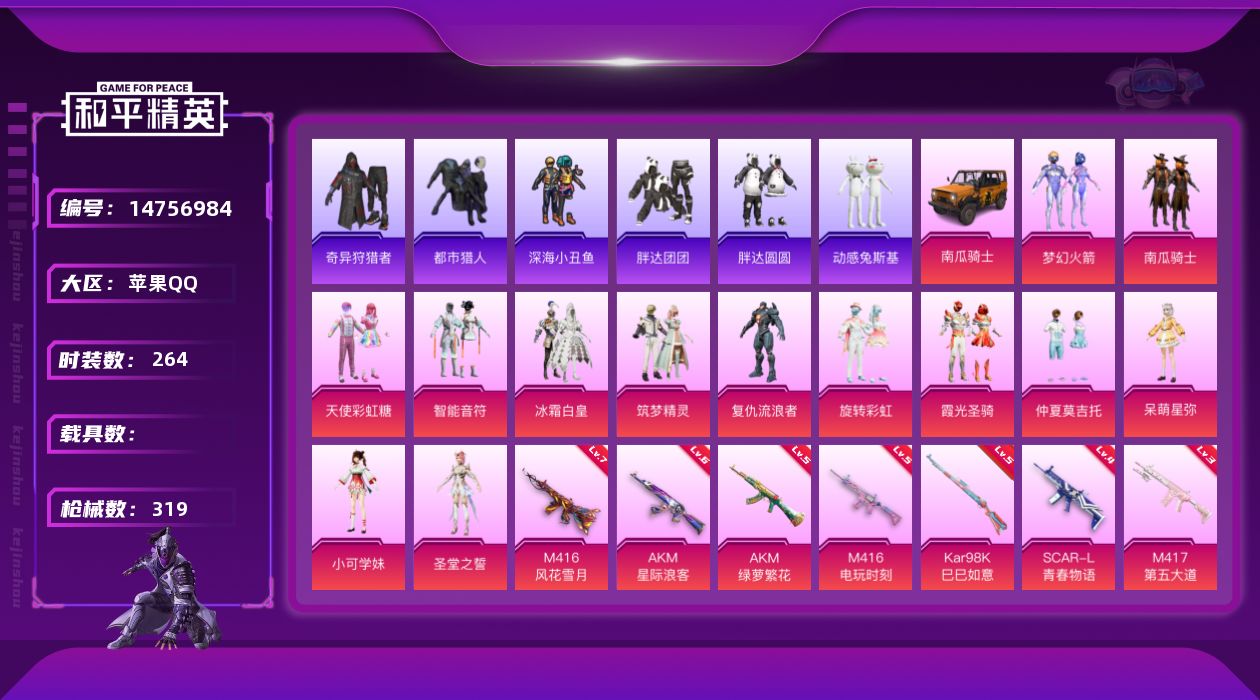 [14756984]【mhlm2729】苹果 手q-13粉装-10特效呛-0载具-2粉色飞行器-98611热力值-16王牌印记-264套装-319呛皮 【热门品类】:粉装-梦幻火箭,套装-浪漫天命,套装-都市猎人,套装-深海小丑鱼,套装-小丑鱼,套装-奇异狩猎者,套装-胖达团团,套装-胖达圆圆,套装-忍者信条,套装-动感兔斯基人偶服,旭日初心兜帽大衣,套装-龟仙人,套装-潮萌小黄鸭,套装-暗影哥特 【粉色套装】:粉装-南瓜骑士,粉装-天使彩虹糖,粉装-梦幻火箭,粉装-智能音符,粉装-冰霜白皇,粉装-筑梦精灵,角色-复仇流浪者,粉装-旋转彩虹,粉装-霞光圣骑,粉装-仲夏莫吉托,角色-呆萌星弥,角色-小可学妹,角色-圣堂之誓 【粉色呛皮等级】:akm-星际浪客六级,akm-绿萝繁花五级,scar-l-青春物语四级,m416-心之恋语一级,m416-风花雪月七级,m416-暖熊萌萌二级,m416-电玩时刻五级,kar98k-巳巳如意五级,m417-第五大道三级,dp-28-豹影疾电一级 【粉色呛皮】:akm-星际浪客,akm-绿萝繁花,scar-l-青春物语,m416-心之恋语,m416-风花雪月,m416-暖熊萌萌,m416-电玩时刻,kar98k-巳巳如意,m417-第五大道,dp-28-豹影疾电 【粉色飞行器】:童趣迷兔飞行器,千面幻镜飞行器 【粉色降落伞】:幻影战神降落伞,甜心宝贝降落伞,春暖花开降落伞,四圣焕新降落伞,锦绣火鲤降落伞,星之彼岸降落伞,筑梦精灵降落伞,甜梦小狐降落伞,暖熊萌萌降落伞,彩虹甜喵降落伞,旋转彩虹降落伞,暗夜鎏金降落伞,音爆索尼克降落伞,镜光幻境降落伞,鬼刀降落伞 【稀有套装】:套装-龟仙人,套装-巳巳如意,套装-糖糖葫芦,套装-青团波波,角色-摩登魅猫,套装-燕燕于飞,套装-鱼渊荷华,角色-海琴烟 【稀有呛皮】:akm-四圣焕新,akm-夜灯,akm-天启纪元,akm-彩虹符号,akm-影袭,akm-星兔领航员,akm-春暖花开,akm-灼热熔岩,akm-玉龙,akm-环太平洋,akm-破晓战魂,akm-缤纷海域,akm-萌趣颜团子,akm-霓虹街区,akm-龙的传人,m16a4-夜灯,m16a4-幻世战舞者,m16a4-甜心亚梦,m16a4-红色方程式,m16a4-蓝色火焰,scar-l-夜灯,scar-l-炫彩