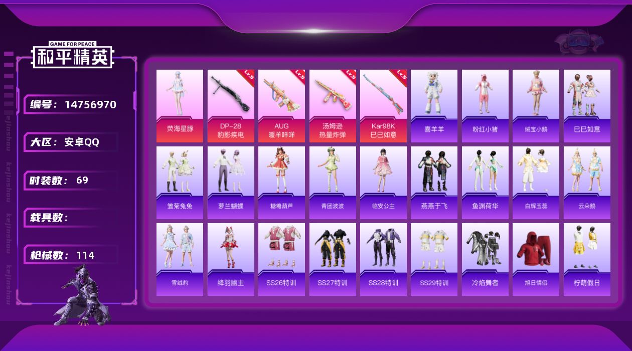 [14756970]连体王者 安卓 手q-1粉装-4特效呛-0载具-2粉色飞行器-30748热力值-4王牌印记-69套装-114呛皮 【热门品类】:套装-粉红小猪 【粉色套装】:角色-荧海星豚 【粉色呛皮等级】:aug-暖羊咩咩五级,汤姆逊-热量炸弹五级,kar98k-巳巳如意五级,dp-28-豹影疾电五级 【粉色呛皮】:aug-暖羊咩咩,汤姆逊-热量炸弹,kar98k-巳巳如意,dp-28-豹影疾电 【粉色飞行器】:天之羽翼飞行器 【粉色降落伞】:第五大道降落伞,圣堂之誓降落伞,金丰海韵降落伞,宁雨蝶降落伞 【稀有套装】:套装-绒宝小鹅,套装-巳巳如意,套装-雏菊兔兔,套装-萝兰蝴蝶,套装-糖糖葫芦,套装-青团波波,角色-临安公主,套装-燕燕于飞,套装-鱼渊荷华,套装-白辉玉蕊,套装-云朵鹅,套装-雪绒豹,角色-绛羽幽主,玩偶服-喜羊羊,套装-炫彩糖果 【稀有呛皮】:aug-冰晶雪宝,akm-龙的传人,scar-l-炫彩节奏,m416-糯团青竹,m416-红色方程式,groza-荧海星豚,aug-天降萌叽,aug-耀粉歌者,q-彩虹符号,m762-云朵鹅,mk47-洛神天依,ac-val-天降萌叽,蜜獾-天降萌叽,uzi-啾咪啾咪,uzi-天降萌叽,ump45-生命誓言,ump45-蓝色火焰,vect-生命誓言,汤姆逊-天降萌叽,p90-巳巳如意,sks-炫彩节奏,mini14-炫彩节奏,svd-云朵鹅,s686-千金淑猫,s1897-炫彩节奏,s1897-荧海星豚,s12k-玩趣呆呆,s12k-极意拳锋,dbs-创世·救赎,spas-12-云朵鹅,m249-彩虹符号,dp-28-彩虹符号,mg3-幻世战舞者,短管霰弹-星穹咏叹调,蝎式手呛-千金淑猫,沙墨之鹦-云朵鹅,大砍刀-云朵鹅,破片手留单-巳巳如意 【其他套装】:套装-ss26特训,套装-ss27特训,套装-ss28特训,套装-ss29特训,套装-冷焰舞者,套装-旭日情侣,套装-柠萌假日,套装-深蓝色名流,套装-特战装甲,套装-玉兔迎春,套装-王牌教练,套装-破蛋小黄鸡,套装-空岛之星,套装-竞技名士,套装-粉红小猪,套装-红色运动,套装-绯格组合,套装-缤纷果语,套装-耀粉歌者,套装-都市魅力,套装-长空猛禽,套装-霓虹街区,套装-青涩时光,套装-顽皮玉兔,套装-魅力单车,套装-鹤鸣,套装-黑色伏地