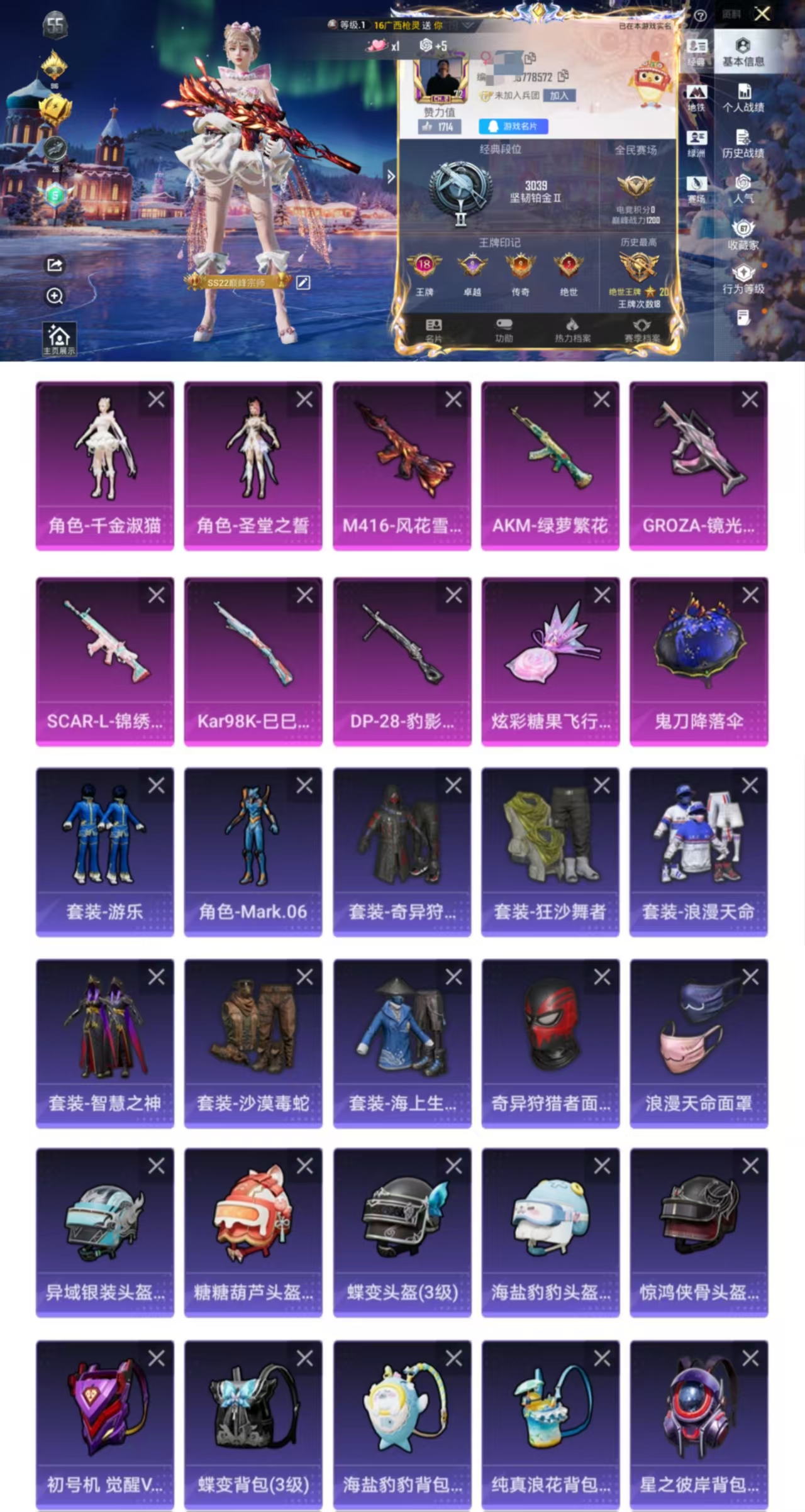 【和平精英】【txhp5614】3粉装,12特效呛,4载具,历史最高段位:无敌战神 王牌印记14次 热力值:69748,133套装,185呛械,198装备,105战备;套装:魔童闹海-哪吒,魔童闹海-敖丙,套装-梦幻火箭,角色-零号机款机体服,角色-羊梦糖心,套装-蓝色运动,套装-白色伏地魔,套装-黑色伏地魔,套装-竞技名士,套装-猛禽,套装-长空猛禽,套装-漫步者,套装-旭日情侣,套装-冷焰舞者,套装-浪漫天命,套装-贵族骑装,套装-特殊使命,套装-龙腾端午,套装-滨海假日,套装-鹰眼刺客,套装-冰冻风暴,套装-人气偶像,套装-特战英豪,套装-街头潮人,套装-魅力单车,套装-绮丽涂鸦,套装-狂沙舞者,套装-热血青春,套装-极地朋克,套装-幻世战舞者,套装-清新柠檬,套装-蓝调潮人,套装-暗影哥特,套装-弄潮海豚,套装-夏日倾情,套装-缤纷果语,套装-风暴特警,套装-冰川特警,套装-格斗先锋,套装-麻辣教官,套装-沙暴袭击者,套装-小丑鱼,套装-冥河战士,套装-粉红小猪,套装-破蛋小黄鸡,套装-鹤鸣,套装-纯白誓言,套装-夏日音浪,套装-探宝勇士,套装-ag战队服,套装-牛气满满,套装-战术大师,套装-ss18特训,套装-银白舞王,角色-赛罗奥特曼,角色-明日香款战斗服,角色-真理款战斗服,套装-龙宫之主,角色-英勇保护者,套装-ss17特训,套装-瑞龙福将,套装-团圆交子,套装-冰爽风暴,套装-福星高照,套装-豚鼠丹丹,套装-虎虎生威吉莉,角色-军刀雅典娜,套装-异彩先驱,套装-霓虹极客,套装-空投萌叽,套装-ss19特训,套装-极速竞梦,套装-飞驰魅影,套装-音速流光,套装-炫蓝之夏,套装-ss20特训,套装-猎梦纪元,套装-甜心亚梦,套装-虚音幻奏,套装-ss21特训,套装-萌趣咩咩,套装-娇憨猪猪,套装-玉兔迎春,套装-ss22特训,套装-光之冒险,套装-绯格组合,套装-ss23特训,套装-莱茵河畔,套装-香榭午后,套装-柠萌假日,套装-香桃花海,套装-龙的传人,套装-ss26特训,套装-空岛之星,套装-明鸳圣池,套装-ss28特训,角色-极地流光,角色-粉雾星云,套装-海盐绵绵冰,套装-ss29特训,套装-异域银装,角色-临安公主,套装-ss30特训,套装-青团波波,套装-棉花软糖,角色-夜瞳黯灵,套装-糖糖葫芦,套装-ss31特训,套装-鱼渊荷华,套装-燕燕于飞,套装-智谋强哥,套装-迷雾之月,套装-ss33特训,套装-云朵鹅,套装-巳巳如意,套装-ss32特训,套装-彩虹兔,套装-雪绒豹,角色-时希公主,套装-炫彩糖果,角色-乐音,玩偶服-懒羊羊,玩偶服-美羊羊,套装-元气之梦,套装-ss34特训,套装-擎苍青焰,套装-朱霞炽焰,套装-游乐,套装-凌霄紫焰,套装-ss35特训,套装-午间小调,套装-风迹短诗,套装-ss36特训;呛皮:q-洛神天依,q-飞驰魅影,蜜獾-娇憨猪猪,蜜獾-垂柳戏鸭,蜜獾-天降萌叽,蜜獾-糖糖葫芦,蜜獾-绯穹魔姬,蜜獾-风迹短诗,蜜獾-冰澜龙吟,蜜獾-乌木金纹,7级scar-l-金蛇镇世,1级scar-l-魔童闹海 哪吒,scar-l-甜蜜誓约,scar-l-炫彩节奏,scar-l-龙宫之主,scar-l-彩虹符号,scar-l-玉兔迎春,scar-l-星途旅人,scar-l-海盐豹豹,m16a4-冥河战士,m16a4-甜心亚梦,m16a4-幻世战舞者,aug-青春冒险家,aug-异域银装,mk47-洛神天依,mk47-乌木金纹,mk47-风迹短诗,groza-治愈之星,groza-异彩先驱,groza-晶梦幻蝶,groza-荧海星豚,m762-瑞龙福将,m762-彩虹符号,m762-第五大道,m762-天降萌叽,m762-云朵鹅,5级akm-炫紫旋律,akm-灼热熔岩,akm-霓虹街区,akm-涂鸦街区,akm-彩虹符号,akm-虎虎生威,akm-龙的传人,akm-霓彩脉冲,ac-val-甜心亚梦,ac-val-天降萌叽,famas-镜域双华,famas-乌木金纹,5级m416-风花雪月,3级m416-墨龙九天,m416-糯团青竹,arx-凌霄紫焰,g36c-乌木金纹,莫辛纳甘-乌木金纹,莫辛纳甘-风迹短诗,amr-喜羊羊与灰太狼,amr-乌木金纹,5级kar98k-巳巳如意,kar98k-金玉无双,kar98k-梦幻火箭,kar98k-炫彩节奏,kar98k-电玩视界,kar98k-飞驰魅影,kar98k-乌木金纹,win94-瑞龙福将,win94-乌木金纹,m200-仲夏莫吉托,m200-乌木金纹,svd-云朵鹅,m24-影袭,m24-奇异狩猎者,m24-炫彩节奏,m24-乌木金纹,awm-黄金龙骨,awm-恐龙拽拽,4级m417-第五大道,m417-蓝晶绮麟,5级mk14-甜梦熊击,mk14-乌木金纹,mk14-薄荷星砂,mk20-h-星梦奇缘,mk20-h-星途旅人,mk20-h-糖糖葫芦,mk20-h-狂鲨锋刃,mk20-h-乌木金纹,mini14-穿刺龙虾,mini14-龙宫之主,mini14-异彩先驱,mini14-香桃花海,slr-娇憨猪猪,slr-彩虹符号,vss-香桃花海,mk12-金蛇镇世,mk12-风迹短诗,sks-炫彩节奏,1级p90-魔童闹海 敖丙,p90-飞驰魅影,p90-金蛇镇世,p90-乌木金纹,野牛-燕燕于飞,野牛-乌木金纹,aks-74u-乌木金纹,uzi-影袭,uzi-炫彩节奏,uzi-娇憨猪猪,uzi-啾咪啾咪,uzi-炫彩糖果,汤姆逊-异彩先驱,汤姆逊-环太平洋,汤姆逊-天降萌叽,汤姆逊-星梦奇缘,vect-彩虹符号,vect-暗夜玫瑰,vect-燕燕于飞,js9-凌霄紫焰,5级ump45-相思残雪,ump45-夜灯,ump45-生命誓言,ump45-糖糖葫芦,mp5k-甜蜜誓约,mp5k-蓝莓炮弹,mp5k-异彩先驱,dbs-甜心亚梦,dbs-第五大道,dbs-风迹短诗,dbs-乌木金纹,s12k-龙宫之主,s12k-瑞龙福将,s12k-娇憨猪猪,s12k-幻世战舞者,s12k-霓彩脉冲,s686-彩虹符号,s1897-炫彩节奏,s1897-飞驰魅影,s1897-精灵梦叶罗丽,spas-12-燕燕于飞,spas-12-狂鲨锋刃,spas-12-云朵鹅,spas-12-钛晶裂爪,spas-12-乌木金纹,mg3-瑞龙福将,mg3-幻世战舞者,mg3-乌木金纹,mg3-第五大道,mg3-镜域双华,5级dp-28-豹影疾电,dp-28-彩虹符号,dp-28-甜心亚梦,m249-四圣焕新,m249-彩虹符号,m249-沙丘之主,5级mg-36-沧焰双生,mg-36-凌霄紫焰,电击呛-喜羊羊与灰太狼,p18c-糖糖葫芦,蝎式手呛-燕燕于飞,沙墨之鹦-云朵鹅,p92-凌霄紫焰,大砍刀-黑金刀,大砍刀-云朵鹅,大砍刀-冰澜龙吟,平底锅-瑞龙福将,平底锅-异彩先驱,平底锅-飞驰魅影,平