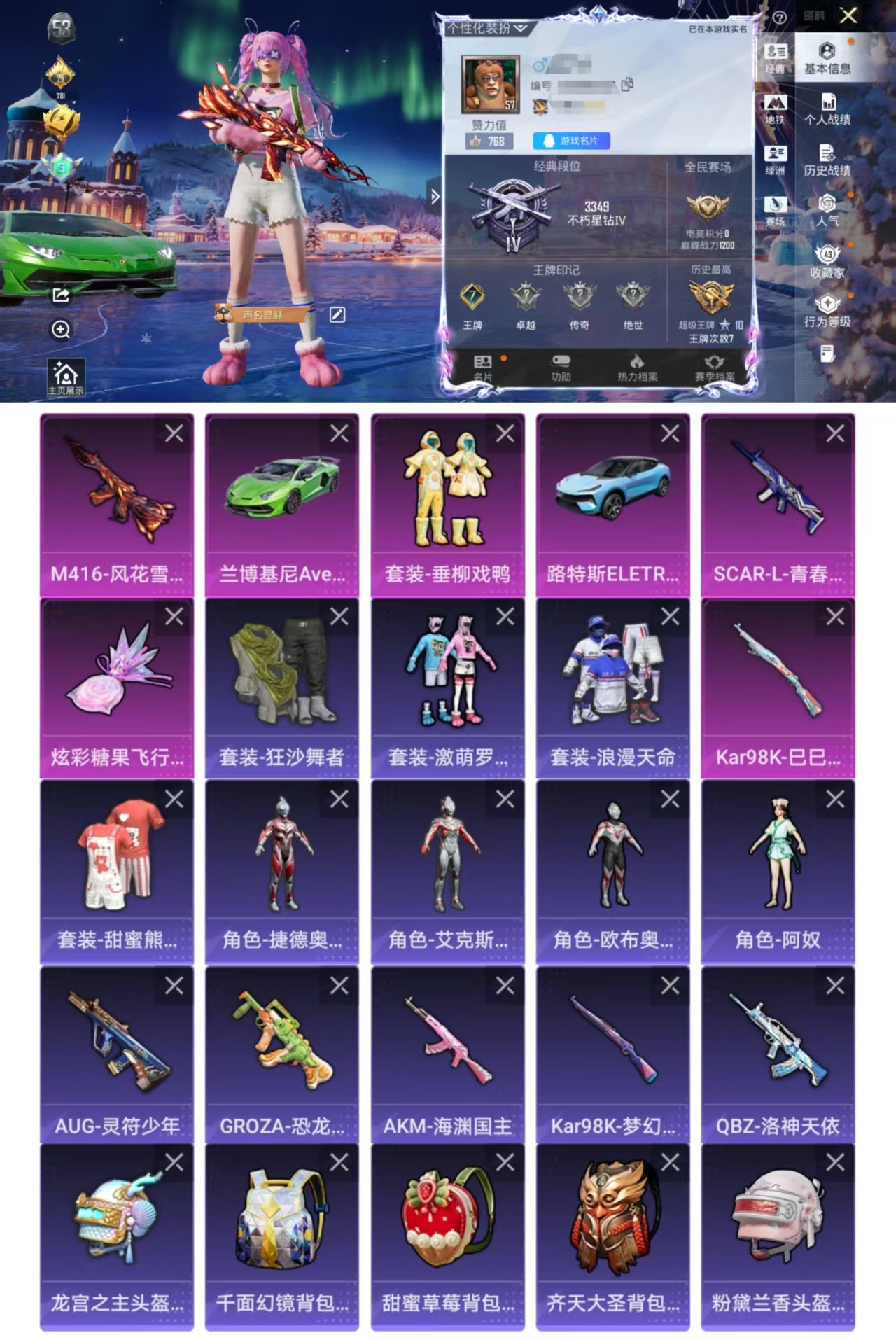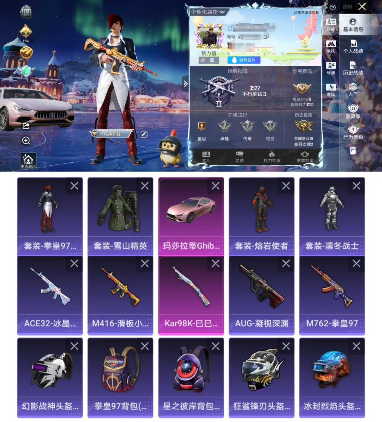 【粉玛莎】1特效呛-67呛皮-48套装-1载具 【1载具】 玛莎拉蒂粉色 【1特效呛】 kar98k-巳巳如意 【7头盔】 冰封烈焰头盔3级 黑色刀锋头盔3级 霓虹街区头盔3级 狂鲨锋刃头盔3级 破晓战魂头盔3级 异域银装头盔3级 冰河战士头盔3级 【23背包】 雪国风尚背包1级 雪国风尚背包2级 霓虹街区背包3级 霓虹街区背包1级 星之彼岸背包2级