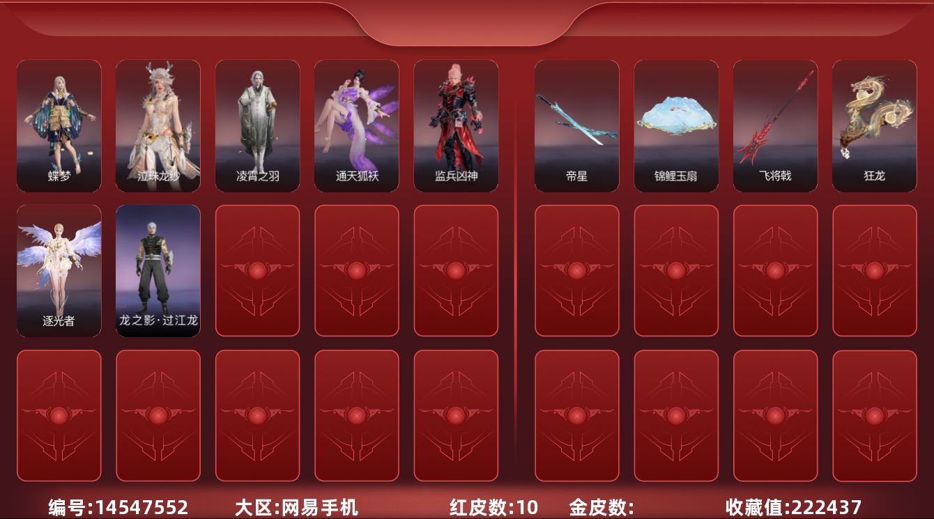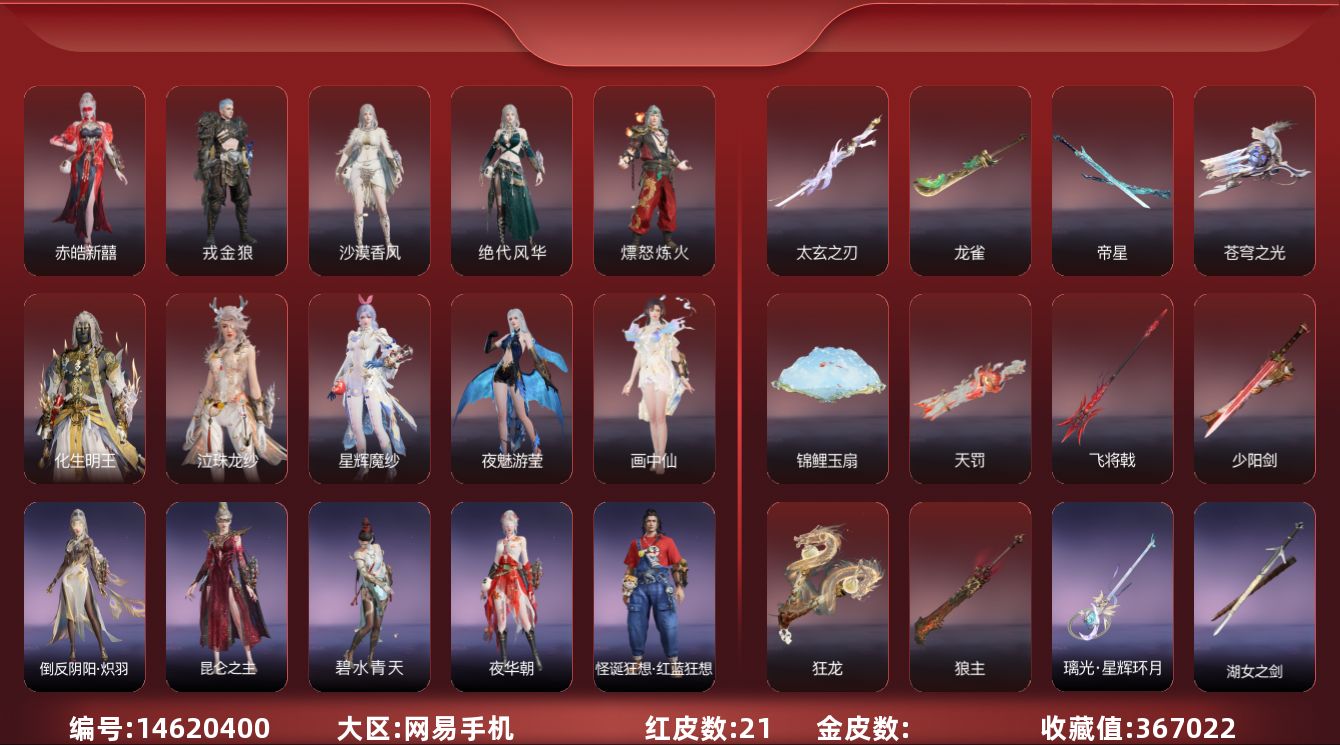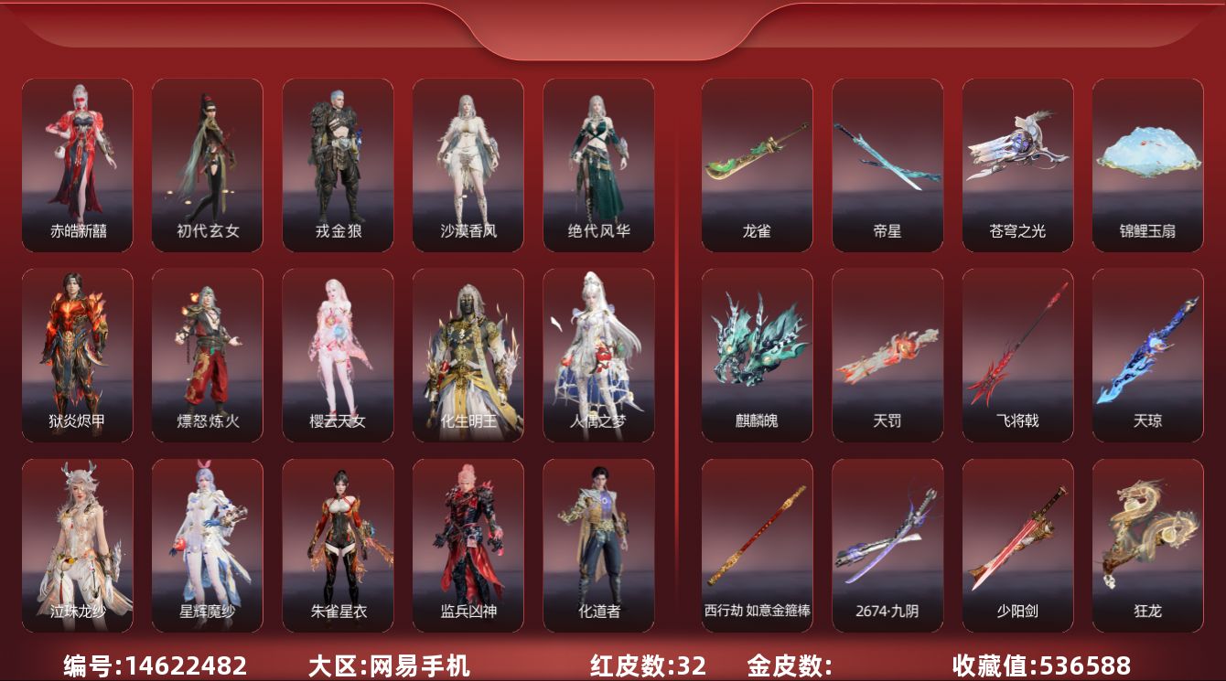 [14622482]0akikd网易手机32个红皮泳装8个【高校水着(胡桃),仲夏霜华(顾清寒),弄潮逐浪(崔三娘),半夏晚风(魏轻),初夏绯莓(沈妙),长夏清澜(殷紫萍),盛夏白阳(季莹莹),赤夏悠漾(玉玲珑),精武魂(季沧海),】奥义特效12个【神君印(岳山),赤徽(岳山),荆魂岳山,炎烈珠(季沧海),初代机(沈妙),绿野守护·竹韵悠(沈妙),珥冰(天海),百战·枷锁(魏轻),楚韵九歌·四海(哈迪),镇冥司刘炼),雪霜姿顾清寒),夜蔷薇(季莹莹),】小技能特效3个【剪纸·彩刀(妖刀姬),三娃葫芦(天海),千秋匠心·凶虎(胡为),】胡为吕布全套,岳山杨戬变身器三尖两刃刀全套,武器红皮12个【帝星,麒麟魄,烈阳,西行劫·如意金箍棒,2674·九阴,飞将戟,锦鲤玉扇,天琼,狂龙,少阳剑,苍穹之光,天罚,】其他红皮20个【流金晓锦,画中仙,狱炎烬甲,龙雀,人偶之梦,星辉魔纱,樱云天女,监兵凶神,执明神君,化道者,赤皓新囍,化生明王,泣珠龙纱,墨离,朱雀星衣,沙漠香风,初代玄女,戎金狼,绝代风华,熛怒炼火,】飞鼠,劫涛·潮,春桃笑,海神三叉戟,杨戬,自动人形·a2,悟空,玄豹姿,唐三,龙心炽焰,信手斩龙,梨园传奇·素贞,龙之影·龙虎斗,百战·破荆者,观山海·夏神祝融,巨阙,紫金玉女,夜华朝,银狼裘,浣烟纱,龙门·飞天,神鹰之女,夜吻,观山海·青鸟,长歌诗韵·胡旋女,千秋匠心·玉叶景,春桃笑,长歌诗韵·遣唐使,武道无穷·少林,龙之影·过江龙,常胜袍,逆水寒·鸢纱,司天命,金襦玉衫,藏雨阁主,西行劫·玉兔精,寒烟素,花之倾奇,沐昭,观山海·冬神玄冥,武道无穷·八极,干将莫邪,斑斓衣,观山海·秋神蓐收,黄昏巫主,日影花阴,夜绸袍,西行劫·紫衣仙子,绮云衫,楚韵九歌·山鬼,劫涛·潮,西行劫·三尖两刃刀,代号·玉脍,咯咯,咕咕(连弩),楚韵九歌·四海,葫芦兄弟·蛤蟆头领,封神录·申公豹,阿娜希塔,封神录·龙吉公主,封神录·姜子牙,观山海·精卫,绿野守护·暗沼摩罗,赤雾烟霞,绿野守护·山漠狞影,绿野守护·悠竹萌客,拳皇·不知火舞,巫师3·杰洛特,庖丁·肴婵,决战平安京·恋念私语,