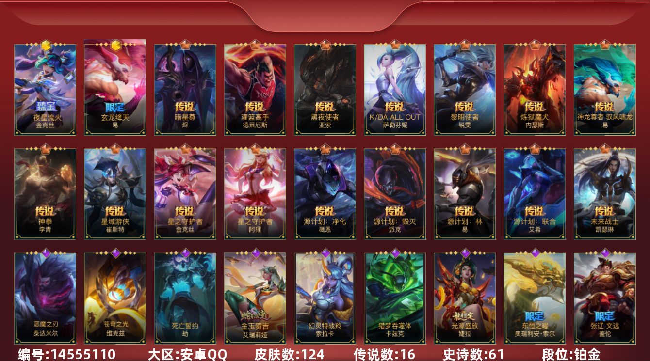 [14555110]2神话 1限定 16传说 61史诗 124皮肤 可二次 可修改实名 信用分低,需要打3把匹配 【段位】:铂金 【神话皮】:夜星流火 金克丝玄龙绛天 易 【限定皮肤】:张辽文远 【传说皮】:暗星尊源计划:毁灭未来战士女警神拳盲僧神龙尊者 驭风啸龙星域游侠卡牌炼狱魔犬黎明使者锐雯k/da allout萨勒芬妮黑夜使者亚索灌篮高手星之守护者金克丝源计划:林星之守护者阿狸源计划:联合源计划:净化