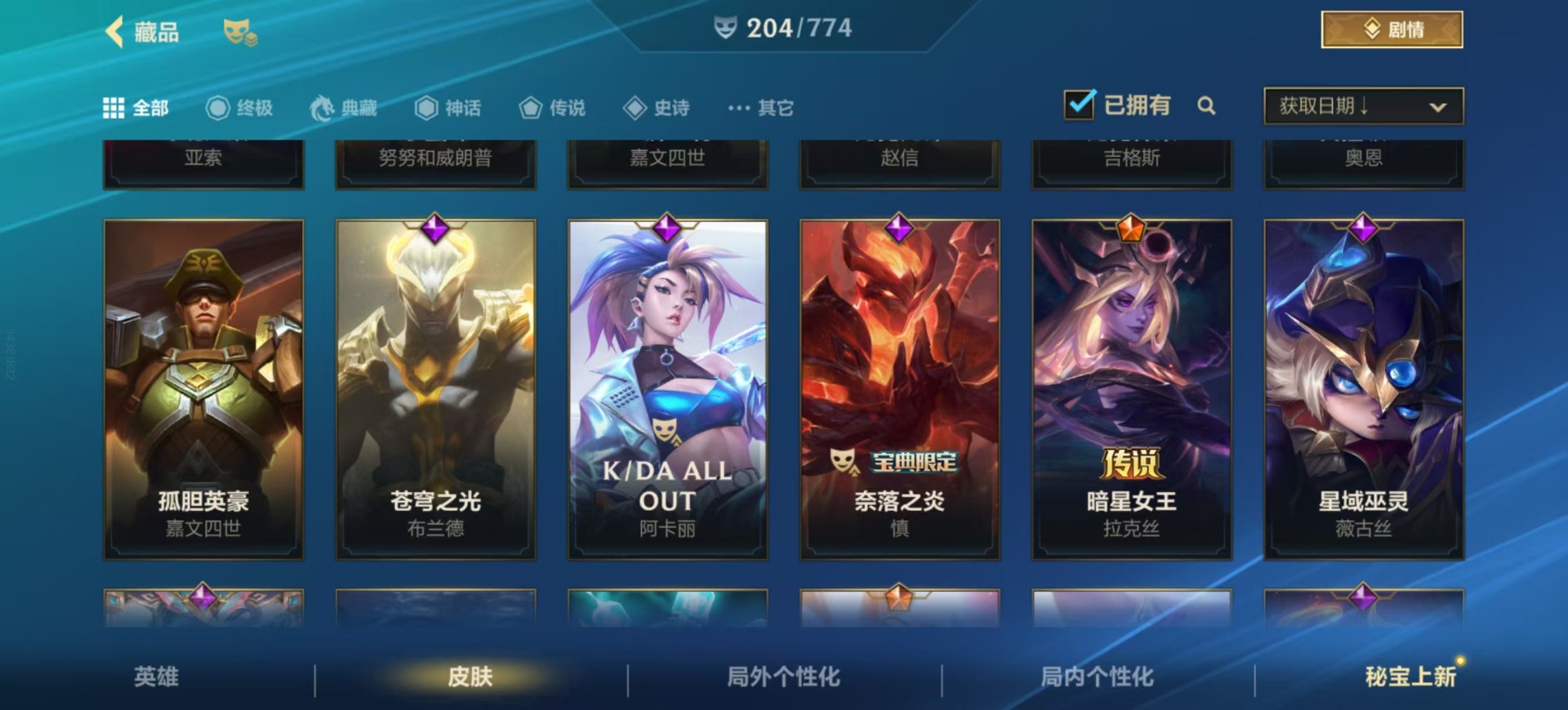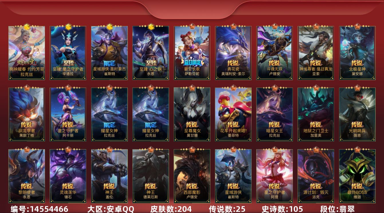 4神话 5限定 25传说 105史诗 204皮肤 可二次 可修改实名 【段位】:翡翠 【神话皮】:至臻 星之守护者 辛德拉桃映暖春 灼灼芳菲 拉克丝星域游侠卡牌圣时豪杰至臻心之钢永恩 【限定皮肤】:掠星魔刃耀星女神拉克丝闭月之颜貂蝉水晶玫瑰皇子水晶玫瑰永恩 【传说皮】:碧空长歌 萨勒