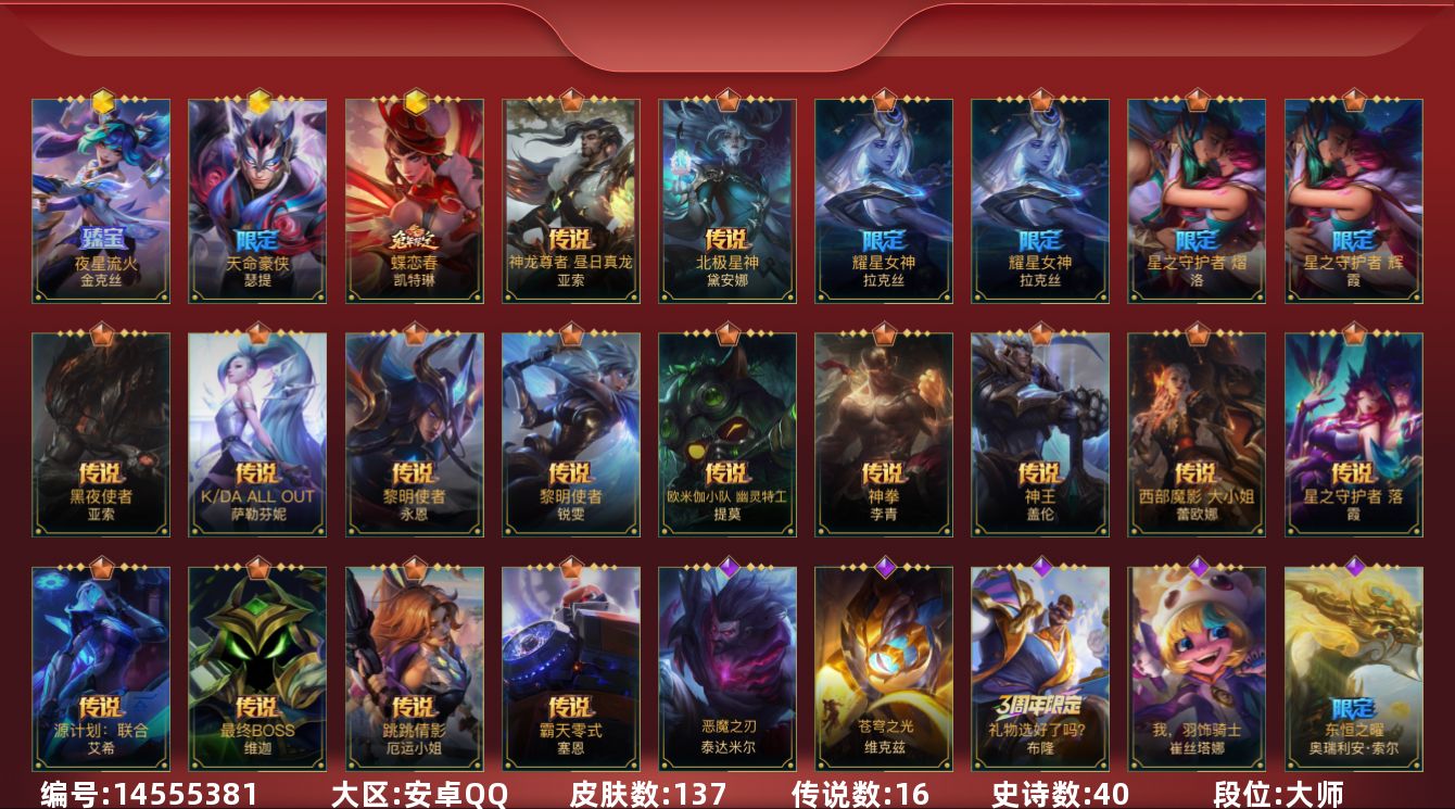 3神话 4限定 16传说 40史诗 137皮肤 可二次 可修改实名 【段位】:大师 【神话皮】:夜星流火 金克丝天命豪侠 瑟提蝶恋春女警 【限定皮肤】:地底世界卡牌耀星女神拉克丝星之守护者霞星之守护者洛 【传说皮】:西部魔影大小姐蕾欧娜霸天零式塞恩神龙尊者 昼日真龙 亚索北极星神