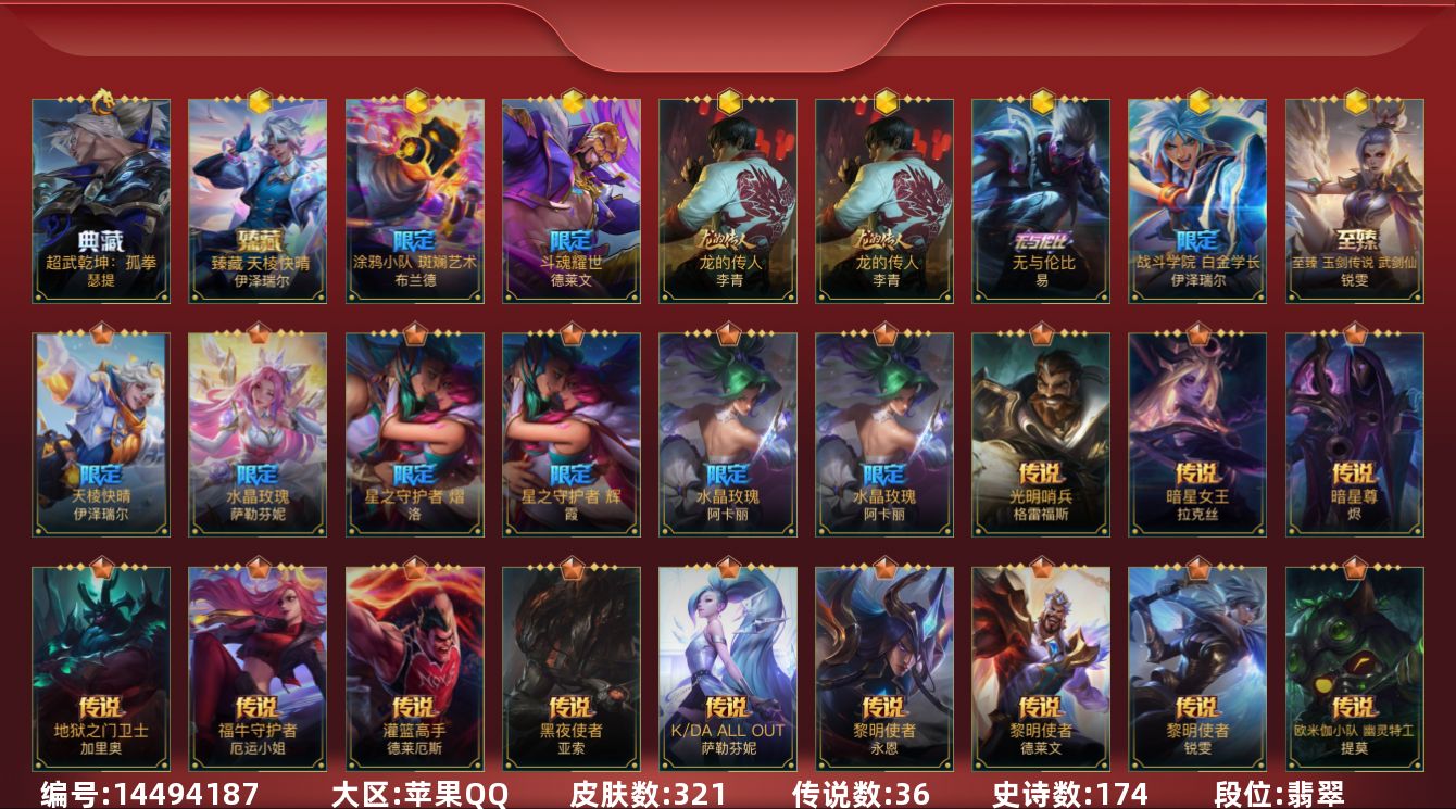 1典藏 6神话 23限定 36传说 174史诗 321皮肤 可二次 可修改实名 【段位】:翡翠 【典藏皮】:超武乾坤:孤拳 【神话皮】:臻藏 天棱快晴 伊泽瑞尔战斗学院ez白金学长斗魂耀世德莱文至臻锐雯涂鸦小队斑斓艺术布兰德龙的传人 【限定皮肤】:龙的传人穿星魔锋掠星魔刃御星魔矢