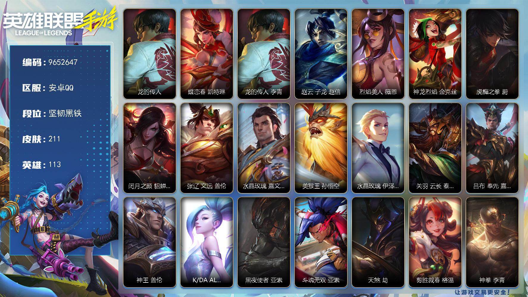 [14074383]【编号26802】【店长推荐精品号】113英雄-246皮肤 【神话皮肤】:龙的传人 李青 【限定皮肤】:龙的传人 李青,赵云 子龙 赵信,水晶玫瑰 娑娜 【传说皮肤】:神王 盖伦,源计划:净化 薇恩,暗星尊 烬,星域游侠 崔斯特,水晶玫瑰 萨勒芬妮,黑夜使者 亚索,天煞 劫,西部魔影 卢锡安,剪胜裁春 格温,神拳 李青,炼狱魔犬 内瑟斯,黎明使者 永恩,源计划:林 易,神王 德莱厄斯,女主播 迦娜,西部天使 艾希,黎明使者 锐雯,战斗学院 伊泽瑞尔,地狱之门卫士 加里奥,源计划:泯灭 雷克顿 【史诗皮肤】:钢铁军团 盖伦,腥红之月 亚托克斯,星之守护者 拉克丝,地狱火 阿木木,摄魂猎手 凯隐,霸天战士 雷恩加尔,雷喵喵尔 雷恩加尔,黎明使者 卡尔玛,星域先知 卡尔玛,丧尸 努努和威朗普,太空律动 “舞林双子” 努努和威朗普,地狱行者 孙悟空,探梦奇旅 艾克,暗星 奥莉安娜,腥红之月 黛安娜,无限烈焰 黛安娜,焕影迎春 佐伊,恶魔之刃 泰达米尔,赵云 子龙 赵信,霸天异形 卡兹克,暗星 卡兹克,清剿小队 金克丝,烘焙童谣 悠米,末路管家 布隆,灭迹行者 烬,东恒之曜 奥瑞利安·索尔,弹幕天使 卡莎,斗魂无双 尼菈,魅惑女巫 莫甘娜,玉剑传说 苍鸾 莫甘娜,k/da all out 伊芙琳,猎龙勇士 潘森,清剿小队 潘森,铁血女忍 阿卡丽,k/da all out 阿卡丽,源计划:暗影 阿卡丽,泳池派对 菲奥娜,福牛守护者 菲奥娜,苹果机器人 布里茨,悦鼓春生 萨勒芬妮,银河魔装机神 安妮,福牛守护者 安妮,源计划:风 亚索,幻梦甜心 阿狸,死亡誓约 劫,武神 贾克斯,屠龙勇士 凯尔,娜就去看看 崔丝塔娜,大魔王 提莫,灵魂莲华 提莫,小蜜蜂 提莫,电玩女神 娑娜,水晶玫瑰 娑娜,泳池派对 璐璐,驯龙女巫 璐璐,破败军团 希瓦娜,炼狱魔女 蔚,燎原烈焰 蔚,暮星之羽 霞,太空律动 “百万调音” 格温,源代码 卡蜜尔,魔女 卡蜜尔,星域审判官 卡蜜尔,裂帛剪春 卡蜜尔,福牛守护者 嘉文四世,泳池派对 李青,地下拳王 李青,柯基 库奇,盗梦者 内瑟斯,魅惑女巫 厄运小姐,破败军团 厄运小姐,龙腾虎跃 瑟提,西部魔影 德莱厄斯,福牛守护者 德莱厄斯,泳池派对 格雷福斯,禁卫机甲 格雷福斯,战斗教授 格雷福斯,绝命机甲 格雷福斯,魅惑女巫 迦娜,灵魂收割者 德莱文,福牛守护者