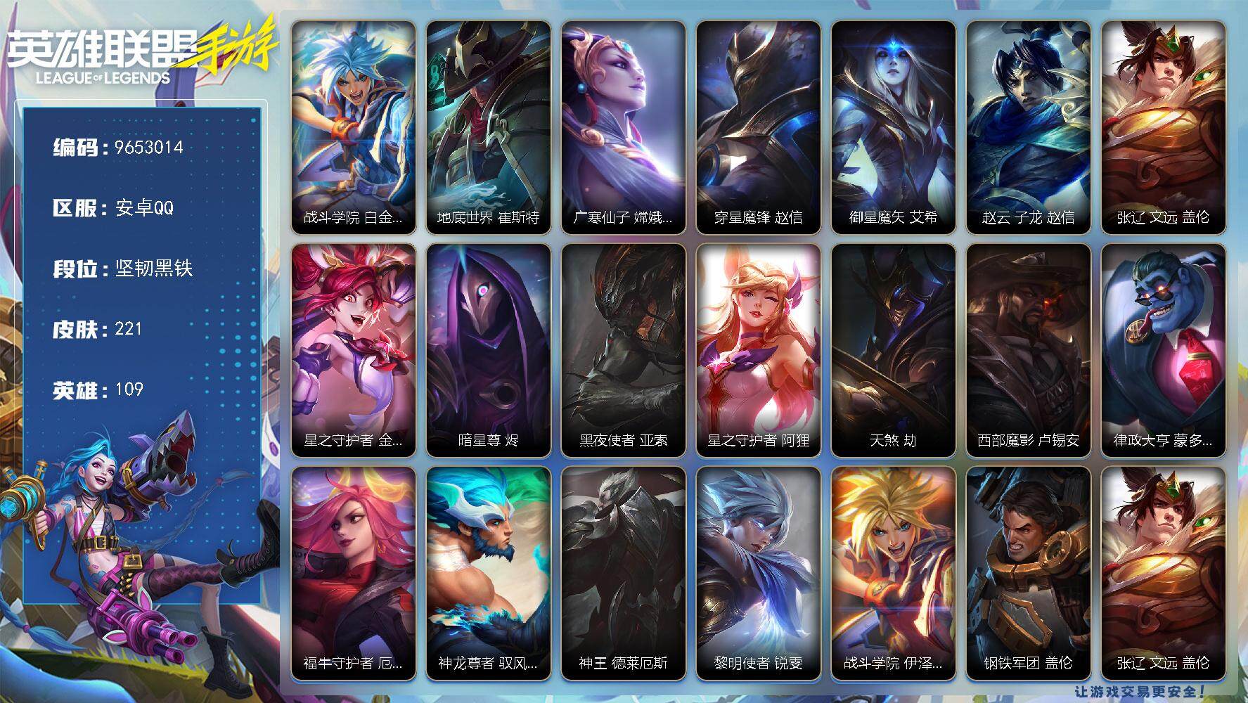 [14075180]【编号33709】【店长推荐捡漏号】107英雄-152皮肤 【限定皮肤】:赵云 子龙 赵信,水晶玫瑰 娑娜 【传说皮肤】:神王 盖伦,源计划:净化 薇恩,光明哨兵 薇恩,星之守护者 金克丝,暗星尊 烬,星域游侠 崔斯特,天煞 劫,西部魔影 卢锡安,欧米伽小队 幽灵特工 提莫,神拳 李青,神龙尊者 驭风啸龙 易,战斗学院 伊泽瑞尔 【史诗皮肤】:腥红之月 亚托克斯,星域先知 卡尔玛,地狱行者 孙悟空,探梦奇旅 艾克,泳池派对 奥莉安娜,赵云 子龙 赵信,猎龙勇士 赵信,霸天异形 卡兹克,末路管家 布隆,灭迹行者 烬,霸天龙神 奥瑞利安·索尔,k/da all out 卡莎,神龙尊者 玉境灵龙 卡莎,k/da all out 伊芙琳,泳池派对 菲奥娜,福牛守护者 菲奥娜,福牛守护者 安妮,战场之王 亚索,幻梦甜心 阿狸,灵能特工 劫,欧米伽小队 魔鬼伞兵 崔丝塔娜,小恶魔 崔丝塔娜,娜就去看看 崔丝塔娜,大魔王 提莫,小蜜蜂 提莫,水晶玫瑰 娑娜,泳池派对 璐璐,星之守护者 璐璐,燎原烈焰 蔚,星域审判官 卡蜜尔,福牛守护者 嘉文四世,冰封王子 蒙多医生,盗梦者 内瑟斯,破败军团 厄运小姐,西部魔影 德莱厄斯,福牛守护者 德莱厄斯,战斗教授 格雷福斯,破败军团 德莱文,福牛守护者 阿利斯塔,霸天巨兽 墨菲特,冰川巨兽 墨菲特,绒毛 菲兹,战场之王 吉格斯,玉剑传说 武剑仙 锐雯,光明哨兵 锐雯,暗星 韦鲁斯,玉剑传说 舞剑仙 艾瑞莉娅,死亡誓约 卡特琳娜,神奇先驱 杰斯,灵能特工 莎弥拉,猎龙勇士 奥拉夫,苍穹之光 布兰德,灵魂烈焰 布兰德,泳池派对 雷克顿,西部魔影 锤石,盗梦暗影 锤石,古神 沃里克 【赛季皮肤】:s1光耀之刃,s2光耀之芒,s3光耀之灵,s4光耀之心,s5绯金魅影,s6绯金丽刃,s7绯金战斧,s8绯金鮫灵,s9王牌舰长,s10王牌上将,s11王牌勇将,s11王牌司令 【其他皮肤】:暗黑武士 雷恩加尔,脏兮兮 努努和威朗普,三昧真火 孙悟空,斗战胜佛 孙悟空,苍穹之光 薇恩,觅心猎手 薇恩,猎龙勇士 薇恩,哥特女仆 奥莉安娜,光耀之心 奥莉安娜,光耀之刃 泰达米尔,末路狂花 金克丝,光耀之芒 金克丝,双城之战 金克丝,狮心 布隆,赌侠 崔斯特,探戈灵魂 崔斯特,王牌舰长 崔斯特,刀锋女王 莫甘娜,探戈灵魂 伊芙琳,绯金魅影 伊芙琳,银色之牙 阿
