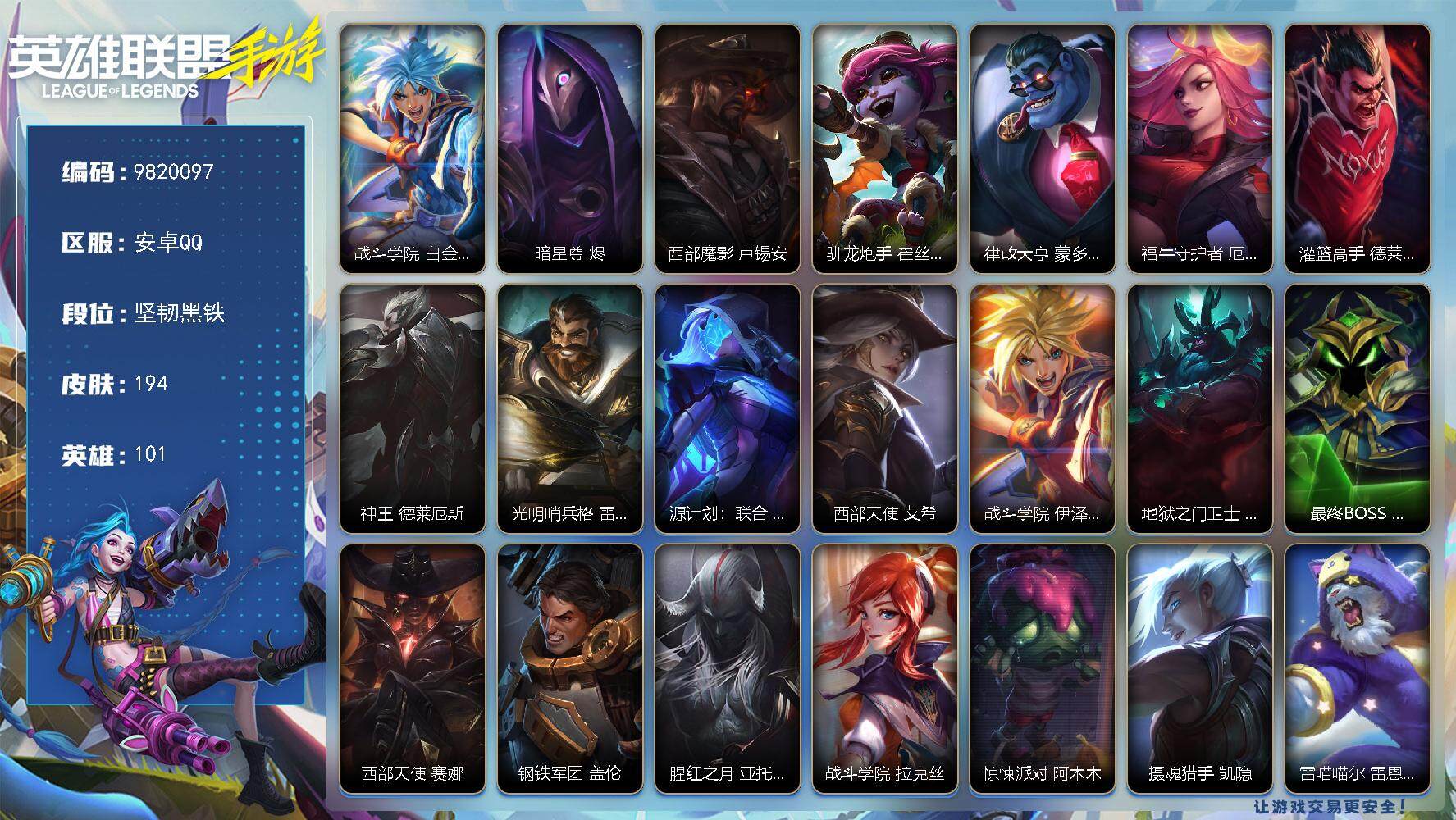 [14074803]【编号82586】【店长推荐捡漏号】101英雄-194皮肤 【神话皮肤】:战斗学院 白金学长 伊泽瑞尔 【传说皮肤】:暗星尊 烬,西部魔影 卢锡安,驯龙炮手 崔丝塔娜,律政大亨 蒙多医生,福牛守护者 厄运小姐,灌篮高手 德莱厄斯,神王 德莱厄斯,光明哨兵 格雷福斯,源计划:联合 艾希,西部天使 艾希,战斗学院 伊泽瑞尔,地狱之门卫士 加里奥,最终boss 维迦,西部天使 赛娜 【史诗皮肤】:钢铁军团 盖伦,腥红之月 亚托克斯,战斗学院 拉克丝,惊悚派对 阿木木,摄魂猎手 凯隐,雷喵喵尔 雷恩加尔,星域先知 卡尔玛,丧尸 努努和威朗普,暗星 奥莉安娜,泳池派对 奥莉安娜,无限烈焰 黛安娜,霸天异形 卡兹克,暗星 卡兹克,末路管家 布隆,圣诞老人 布隆,源计划:升华 烬,灭迹行者 烬,腥红之月 崔斯特,电玩女神 卡莎,k/da all out 卡莎,魅惑女巫 莫甘娜,k/da all out 伊芙琳,猎龙勇士 潘森,清剿小队 潘森,k/da all out 阿卡丽,源计划:暗影 阿卡丽,源计划:火 菲奥娜,泳池派对 菲奥娜,福牛守护者 菲奥娜,苹果机器人 布里茨,战场之王 布里茨,海之歌 萨勒芬妮,银河魔装机神 安妮,源计划:风 亚索,战场之王 亚索,电玩女神 阿狸,k/da all out 阿狸,幻梦甜心 阿狸,死亡誓约 劫,灵能特工 劫,源计划:山 蕾欧娜,泳池派对 蕾欧娜,欧米伽小队 魔鬼伞兵 崔丝塔娜,小恶魔 崔丝塔娜,娜就去看看 崔丝塔娜,电玩女神 娑娜,泳池派对 璐璐,驯龙女巫 璐璐,银河魔装机神 希瓦娜,源计划:裁决 蔚,燎原烈焰 蔚,暮星之羽 霞,太空律动 “百万调音” 格温,源代码 卡蜜尔,魔女 卡蜜尔,星域审判官 卡蜜尔,福牛守护者 嘉文四世,泳池派对 李青,地下拳王 李青,nova 天赋觉醒 李青,电玩上校 库奇,柯基 库奇,奈落之炎 凯南,盗梦者 内瑟斯,电玩女神 厄运小姐,破败军团 厄运小姐,海之歌 泽丽,灵魂莲华 永恩,西部魔影 德莱厄斯,福牛守护者 德莱厄斯,泳池派对 格雷福斯,星之守护者 迦娜,魅惑女巫 迦娜,灵魂收割者 德莱文,海之歌 艾希,福牛守护者 阿利斯塔,霸天巨兽 墨菲特,绒毛 菲兹,战场之王 吉格斯,泳池派对 吉格斯,玉剑传说 寒潭夭夭 娜美,电玩勇者 锐雯,光明哨兵 锐雯,暗星 韦鲁斯,玉剑传说 舞剑仙 艾瑞莉娅,西部天使