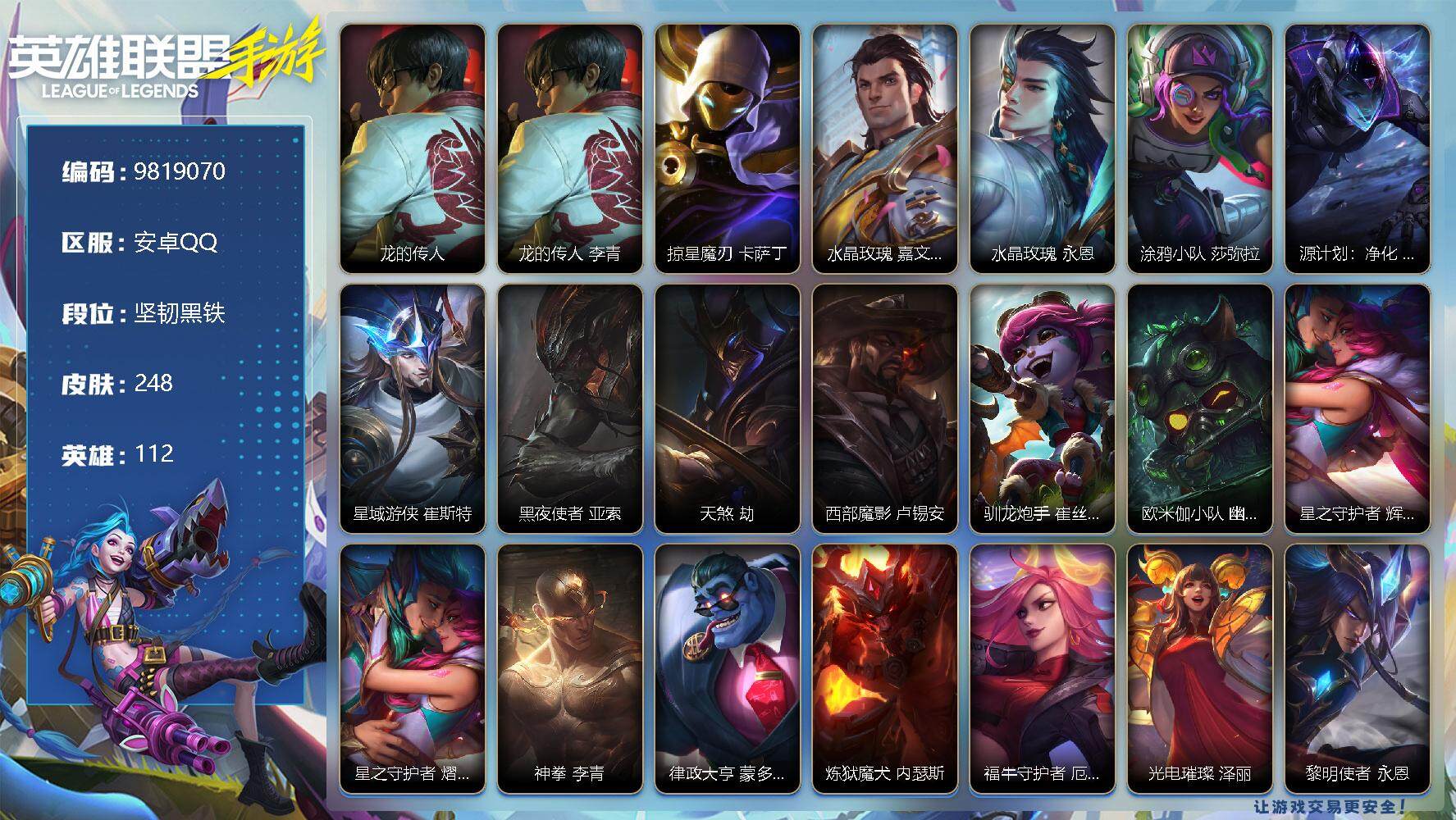 [13328648]【编号04160可秒换绑】店长推荐特价处理精品号 112英雄-248皮肤 【神话皮肤】:龙的传人 李青 【限定皮肤】:龙的传人 李青,掠星魔刃 卡萨丁,水晶玫瑰 嘉文四世,水晶玫瑰 永恩,涂鸦小队 莎弥拉 【传说皮肤】:源计划:净化 薇恩,星域游侠 崔斯特,黑夜使者 亚索,天煞 劫,西部魔影 卢锡安,驯龙炮手 崔丝塔娜,欧米伽小队 幽灵特工 提莫,星之守护者 辉 霞,星之守护者 熠 洛,神拳 李青,律政大亨 蒙多医生,炼狱魔犬 内瑟斯,福牛守护者 厄运小姐,光电璀璨 泽丽,黎明使者 永恩,神龙尊者 驭风啸龙 易,灌篮高手 德莱厄斯,女主播 迦娜,源计划:联合 艾希,黎明使者 锐雯,涂鸦小队 莎弥拉,西部天使 赛娜,霸天零式 赛恩 【史诗皮肤】:钢铁军团 盖伦,星之守护者 拉克丝,睡衣守护者 拉克丝,战斗学院 拉克丝,霸天战士 雷恩加尔,黎明使者 卡尔玛,星域先知 卡尔玛,探梦奇旅 艾克,泳池派对 奥莉安娜,腥红之月 黛安娜,无限烈焰 黛安娜,焕影迎春 佐伊,恶魔之刃 泰达米尔,黑夜使者 泰达米尔,暗星 卡兹克,清剿小队 金克丝,烘焙童谣 悠米,猛虎 布隆,西部牛仔 烬,腥红之月 烬,灭迹行者 烬,圣龙 奥瑞利安·索尔,东恒之曜 奥瑞利安·索尔,腥红之月 崔斯特,弹幕天使 卡莎,k/da all out 卡莎,猎龙勇士 潘森,铁血女忍 阿卡丽,k/da all out 阿卡丽,源计划:暗影 阿卡丽,玉剑传说 无双 菲奥娜,福牛守护者 菲奥娜,苹果机器人 布里茨,福牛守护者 安妮,源计划:风 亚索,电玩女神 阿狸,k/da all out 阿狸,幻梦甜心 阿狸,灵能特工 劫,武神 贾克斯,秘旅探索者 贾克斯,屠龙勇士 凯尔,源计划:山 蕾欧娜,欧米伽小队 魔鬼伞兵 崔丝塔娜,小恶魔 崔丝塔娜,娜就去看看 崔丝塔娜,大魔王 提莫,小蜜蜂 提莫,世界那莫大 提莫,招财进宝 提莫,泳池派对 璐璐,驯龙女巫 璐璐,寒冬精灵 璐璐,银河魔装机神 希瓦娜,秘旅探索者 希瓦娜,源计划:裁决 蔚,燎原烈焰 蔚,源代码 卡蜜尔,水晶玫瑰 嘉文四世,福牛守护者 嘉文四世,泳池派对 李青,地下拳王 李青,冰封王子 蒙多医生,盗梦者 内瑟斯,星之守护者 厄运小姐,魅惑女巫 厄运小姐,破败军团 厄运小姐,源计划:燃 泽丽,龙腾虎跃 瑟提,灵魂莲华 永恩,水晶玫瑰 永恩,玉剑传说 无极 易,西部