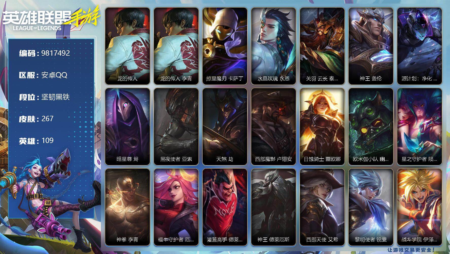 【编号22069可秒换绑】店长推荐特价处理精品号 【商品标题】:109英雄-267皮肤 【神话皮肤】:龙的传人 李青 【限定皮肤】:龙的传人 李青,掠星魔刃 卡萨丁,水晶玫瑰 永恩,关羽 云长 泰达米尔 【传说皮肤】:神王 盖伦,源计划:净化 薇恩,暗星尊 烬,黑夜使者 亚索,天煞 劫,西部魔影 卢锡安,日蚀骑士 蕾欧娜,欧米伽小队 幽灵特工 提莫,星之守护者 陨 洛,神拳 李青,福牛守护者 厄运小姐,灌篮高手 德莱厄斯,神王 德莱厄斯,西部天使 艾希,黎明使者 锐雯,战斗学院 伊泽瑞尔,最终boss 维迦,灵魂莲华 锤石 【史诗皮肤】:钢铁军团 盖伦,战斗学院 拉克丝,惊悚派对 阿木木,殇之机器人 阿木木,摄魂猎手 凯隐,霸天战士 雷恩加尔,雷喵喵尔 雷恩加尔,星域先知 卡尔玛,丧尸 努努和威朗普,地狱行者 孙悟空,暗星 奥莉安娜,泳池派对 奥莉安娜,腥红之月 黛安娜,无限烈焰 黛安娜,恶魔之刃 泰达米尔,猎龙勇士 赵信,霸天异形 卡兹克,暗星 卡兹克,清剿小队 金克丝,烘焙童谣 悠米,圣诞老人 布隆,源计划:升华 烬,西部牛仔 烬,腥红之月 烬,灭迹行者 烬,霸天龙神 奥瑞利安·索尔,圣龙 奥瑞利安·索尔,腥红之月 崔斯特,未来战士 崔斯特,弹幕天使 卡莎,k/da all out 卡莎,神龙尊者 玉境灵龙 卡莎,玉剑传说 苍鸾 莫甘娜,k/da all out 伊芙琳,猎龙勇士 潘森,清剿小队 潘森,铁血女忍 阿卡丽,k/da all out 阿卡丽,源计划:暗影 阿卡丽,源计划:火 菲奥娜,泳池派对 菲奥娜,玉剑传说 无双 菲奥娜,福牛守护者 菲奥娜,海之歌 萨勒芬妮,银河魔装机神 安妮,福牛守护者 安妮,源计划:风 亚索,灵魂莲华 亚索,电玩女神 阿狸,k/da all out 阿狸,幻梦甜心 阿狸,源计划:阴 劫,死亡誓约 劫,武神 贾克斯,灵能特工 凯尔,屠龙勇士 凯尔,未来战士 卢锡安,源计划:山 蕾欧娜,欧米伽小队 魔鬼伞兵 崔丝塔娜,小恶魔 崔丝塔娜,娜就去看看 崔丝塔娜,大魔王 提莫,灵魂莲华 提莫,小蜜蜂 提莫,泳池派对 璐璐,驯龙女巫 璐璐,寒冬精灵 璐璐,秘旅探索者 希瓦娜,破败军团 希瓦娜,燎原烈焰 蔚,暮星之羽 霞,晨星之翎 洛,太空律动 “百万调音” 格温,源代码 卡蜜尔,魔女 卡蜜尔,星域审判官 卡蜜尔,暗星 嘉文四世,福牛守护者 嘉文四世,地下拳王 李青,电玩上校 库奇,奈落之炎 凯南,盗梦者 内瑟斯,龙腾虎跃 瑟提,水晶玫瑰 永恩,持胡萝卜的雪人 易,玉剑传说 无极 易,西部魔影 德莱厄斯,福牛守护者 德莱厄斯,泳池派对 格雷福斯,绝命机甲 格雷福斯,星之守护者 迦娜,玉剑传说 风仙子 迦娜,魅惑女巫 迦娜,灵魂收割者 德莱文,破败军团 德莱文,福牛守护者 阿利斯塔,霸天巨兽 墨菲特,冰川巨兽 墨菲特,银河魔装机神 菲兹,虚空海灵 菲兹,绒毛 菲兹,欧米伽小队 鬼影蛙人 菲兹,战场之王 吉格斯,奥术大师 吉格斯,电玩勇者 锐雯,玉剑传说 武剑仙 锐雯,光明哨兵 锐雯,暗星 韦鲁斯,玉剑传说 舞剑仙 艾瑞莉娅,光明哨兵 艾瑞莉娅,战斗学院 卡特琳娜,睡衣守护者 伊泽瑞尔,心之钢 伊泽瑞尔,秘旅探索者 加里奥,战斗学院 阿克尚,天启骑士 杰斯,神奇先驱 杰斯,霸天战车 厄加特,掠星魔刃 卡萨丁,猎龙勇士 奥拉夫,苍穹之光 布兰德,灵魂烈焰 布兰德,神龙尊者 魔龙 布兰德,泳池派对 雷克顿,我,怒角 维迦,梦境灵探 赛娜,怨之砂 派克,西部魔影 锤石,未来战士 锤石,盗梦暗影 锤石,古神 沃里克,宇航员 诺提勒斯,灵魂莲华 莉莉娅,黑夜使者 莉莉娅,星域巫灵 薇古丝 【赛季皮肤】:s1光耀之刃,s2光耀之芒,s3光耀之灵,s4光耀之心,s5绯金魅影,s6绯金丽刃,s7绯金战斧,s8绯金鮫灵,s9王牌舰长,s10王牌上将,s11王牌勇将,s11王牌司令 【其他皮肤】:死亡骑士 盖伦,海上霸主 盖伦,游侠法师 拉克丝,小小骑士 阿木木,暗黑武士 雷恩加尔,脏兮兮 努努和威朗普,三昧真火 孙悟空,苍穹之光 薇恩,猎龙勇士 薇恩,时之砂 艾克,哥特女仆 奥莉安娜,光耀之心 奥莉安娜,暗黑女武神 黛安娜,国王 泰达米尔,光耀之刃 泰达米尔,关羽 云长 泰达米尔,秘密特工 赵信,末路狂花 金克丝,光耀之芒 金克丝,双城之战 金克丝,猎龙勇士 布隆,狮心 布隆,探戈灵魂 崔斯特,王牌舰长 崔斯特,刀锋女王 莫甘娜,探戈灵魂 伊芙琳,绯金魅影 伊芙琳,银色之牙 阿卡丽,皇家守卫 菲奥娜,绯金丽刃 菲奥娜,兔宝宝 布里茨,冰霜烈焰 安妮,小红帽 安妮,西部牛仔 亚索,腥红之月 亚索,偶像歌手 阿狸,焰尾妖狐 阿狸,冲击之刃 劫,宗师级钓鱼训练师 贾克斯,末世天使 凯尔,绝命呛手 卢锡安,烧烤女神 蕾欧娜,游击队员 崔丝塔娜,兔宝宝 提莫,熊猫 提莫,五连摇滚键盘手 娑娜,缪斯女神 娑娜,邪恶女巫 璐璐,光耀之灵 璐璐,冰霜亚龙 希瓦娜,黯黑魔龙 希瓦娜,铁拳执事 蔚,双城之战 蔚,孤胆英豪 嘉文四世,王牌上将 嘉文四世,海牛骑手 库奇,刺客信条 凯南,腥红之月 凯南,超级英雄 凯南,超武乾坤:电弧 凯南,泳池派对 蒙多医生,战争血统 蒙多医生,熔火之心 拉莫斯,制胜金球 拉莫斯,创世魔神 内瑟斯,单身贵族 内瑟斯,西部牛仔 厄运小姐,女帝 厄运小姐,抵抗军战姬 厄运小姐,暗影 易,热血班长 德莱厄斯,末路教父 格雷福斯,无情重炮 格雷福斯,暴风女神 迦娜,德莱德莱 德莱文,绯金战斧 德莱文,极地女神 艾希,女皇 艾希,黑暗骑士 艾希,王牌司令 艾希,哞利斯塔 阿利斯塔,黑暗骑士 阿利斯塔,无畏号 墨菲特,兔宝宝 菲兹,科学狂人 吉格斯,飞车暴走族 古拉加斯,碎桶者 古拉加斯,鲛妮座人 娜美,河水之灵 娜美,绯金鲛灵 娜美,苍穹之光 韦鲁斯,