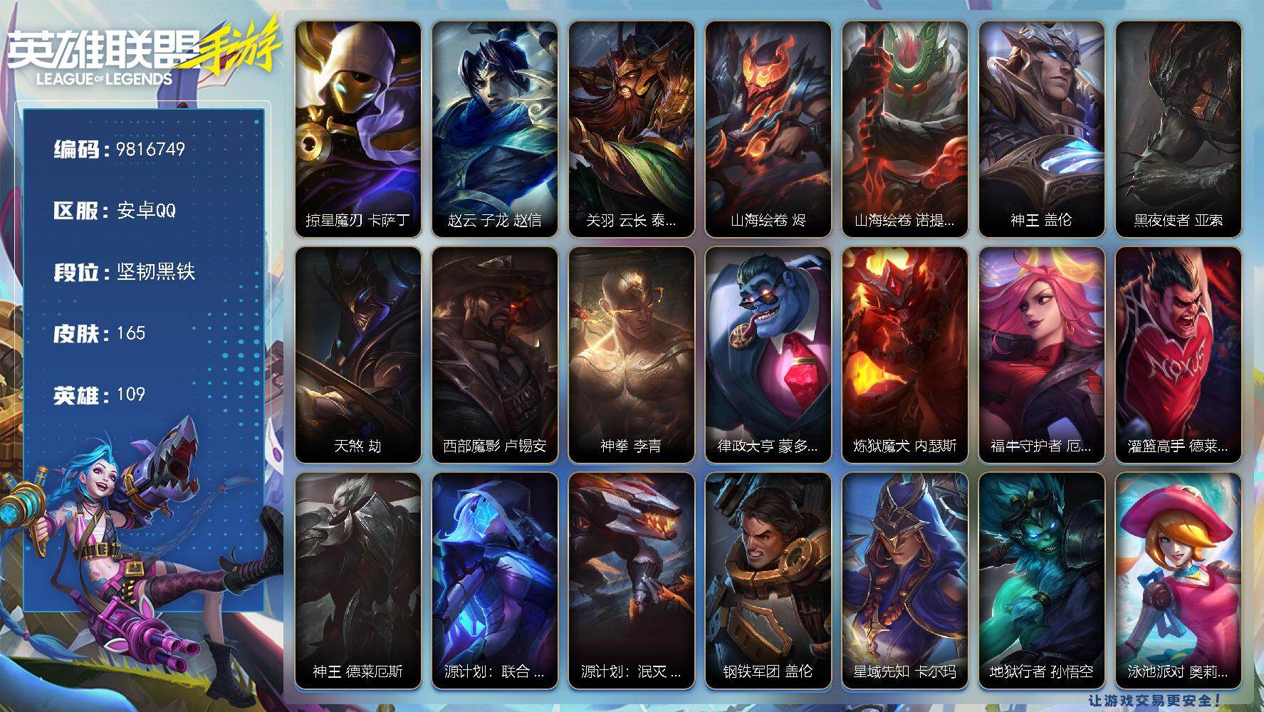 [14074325]【编号72486】【店长推荐精品号】109英雄-165皮肤 【限定皮肤】:掠星魔刃 卡萨丁,赵云 子龙 赵信,关羽 云长 泰达米尔,山海绘卷 烬,山海绘卷 诺提勒斯 【传说皮肤】:神王 盖伦,黑夜使者 亚索,天煞 劫,西部魔影 卢锡安,神拳 李青,律政大亨 蒙多医生,炼狱魔犬 内瑟斯,福牛守护者 厄运小姐,灌篮高手 德莱厄斯,神王 德莱厄斯,源计划:联合 艾希,源计划:泯灭 雷克顿 【史诗皮肤】:钢铁军团 盖伦,星域先知 卡尔玛,地狱行者 孙悟空,泳池派对 奥莉安娜,腥红之月 黛安娜,赵云 子龙 赵信,暗星 卡兹克,清剿小队 金克丝,源计划:升华 烬,西部牛仔 烬,灭迹行者 烬,山海绘卷 烬,霸天龙神 奥瑞利安·索尔,k/da all out 卡莎,猎龙勇士 潘森,清剿小队 潘森,铁血女忍 阿卡丽,k/da all out 阿卡丽,福牛守护者 菲奥娜,战场之王 布里茨,悦鼓春生 萨勒芬妮,福牛守护者 安妮,源计划:风 亚索,战场之王 亚索,灵魂莲华 亚索,幻梦甜心 阿狸,源计划:阴 劫,死亡誓约 劫,武神 贾克斯,源计划:山 蕾欧娜,泳池派对 蕾欧娜,战斗学院 蕾欧娜,小恶魔 崔丝塔娜,娜就去看看 崔丝塔娜,虎头虎脑 崔丝塔娜,大魔王 提莫,小蜜蜂 提莫,电玩女神 娑娜,破败军团 希瓦娜,炼狱魔女 蔚,暮星之羽 霞,太空律动 “百万调音” 格温,源代码 卡蜜尔,暗星 嘉文四世,福牛守护者 嘉文四世,地下拳王 李青,持胡萝卜的雪人 易,玉剑传说 无极 易,西部魔影 德莱厄斯,福牛守护者 德莱厄斯,绝命机甲 格雷福斯,星之守护者 迦娜,灵魂收割者 德莱文,破败军团 德莱文,斗魂无双 德莱文,福牛守护者 阿利斯塔,银河魔装机神 菲兹,泳池派对 吉格斯,电玩勇者 锐雯,白色死神 韦鲁斯,源计划:雄心 卡特琳娜,冬境仙灵 索拉卡,星域学者 索拉卡,秘旅探索者 加里奥,神奇先驱 杰斯,掠星魔刃 卡萨丁,苍穹之光 布兰德,真实伤害 赛娜,西部魔影 锤石,宇航员 诺提勒斯,山海绘卷 诺提勒斯 【赛季皮肤】:s1光耀之刃,s2光耀之芒,s3光耀之灵,s4光耀之心,s5绯金魅影,s6绯金丽刃,s7绯金战斧,s8绯金鮫灵,s9王牌舰长,s10王牌上将,s11王牌勇将,s11王牌司令 【其他皮肤】:死亡骑士 盖伦,海上霸主 盖伦,暗黑武士 雷恩加尔,光明骑士 卡尔玛,苍穹之光 薇恩,哥特