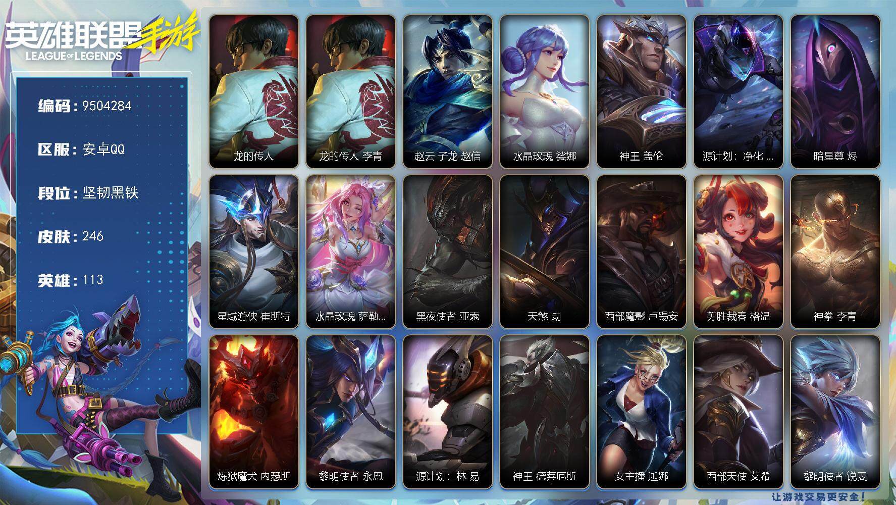 [14074383]【编号26802】【店长推荐精品号】113英雄-246皮肤 【神话皮肤】:龙的传人 李青 【限定皮肤】:龙的传人 李青,赵云 子龙 赵信,水晶玫瑰 娑娜 【传说皮肤】:神王 盖伦,源计划:净化 薇恩,暗星尊 烬,星域游侠 崔斯特,水晶玫瑰 萨勒芬妮,黑夜使者 亚索,天煞 劫,西部魔影 卢锡安,剪胜裁春 格温,神拳 李青,炼狱魔犬 内瑟斯,黎明使者 永恩,源计划:林 易,神王 德莱厄斯,女主播 迦娜,西部天使 艾希,黎明使者 锐雯,战斗学院 伊泽瑞尔,地狱之门卫士 加里奥,源计划:泯灭 雷克顿 【史诗皮肤】:钢铁军团 盖伦,腥红之月 亚托克斯,星之守护者 拉克丝,地狱火 阿木木,摄魂猎手 凯隐,霸天战士 雷恩加尔,雷喵喵尔 雷恩加尔,黎明使者 卡尔玛,星域先知 卡尔玛,丧尸 努努和威朗普,太空律动 “舞林双子” 努努和威朗普,地狱行者 孙悟空,探梦奇旅 艾克,暗星 奥莉安娜,腥红之月 黛安娜,无限烈焰 黛安娜,焕影迎春 佐伊,恶魔之刃 泰达米尔,赵云 子龙 赵信,霸天异形 卡兹克,暗星 卡兹克,清剿小队 金克丝,烘焙童谣 悠米,末路管家 布隆,灭迹行者 烬,东恒之曜 奥瑞利安·索尔,弹幕天使 卡莎,斗魂无双 尼菈,魅惑女巫 莫甘娜,玉剑传说 苍鸾 莫甘娜,k/da all out 伊芙琳,猎龙勇士 潘森,清剿小队 潘森,铁血女忍 阿卡丽,k/da all out 阿卡丽,源计划:暗影 阿卡丽,泳池派对 菲奥娜,福牛守护者 菲奥娜,苹果机器人 布里茨,悦鼓春生 萨勒芬妮,银河魔装机神 安妮,福牛守护者 安妮,源计划:风 亚索,幻梦甜心 阿狸,死亡誓约 劫,武神 贾克斯,屠龙勇士 凯尔,娜就去看看 崔丝塔娜,大魔王 提莫,灵魂莲华 提莫,小蜜蜂 提莫,电玩女神 娑娜,水晶玫瑰 娑娜,泳池派对 璐璐,驯龙女巫 璐璐,破败军团 希瓦娜,炼狱魔女 蔚,燎原烈焰 蔚,暮星之羽 霞,太空律动 “百万调音” 格温,源代码 卡蜜尔,魔女 卡蜜尔,星域审判官 卡蜜尔,裂帛剪春 卡蜜尔,福牛守护者 嘉文四世,泳池派对 李青,地下拳王 李青,柯基 库奇,盗梦者 内瑟斯,魅惑女巫 厄运小姐,破败军团 厄运小姐,龙腾虎跃 瑟提,西部魔影 德莱厄斯,福牛守护者 德莱厄斯,泳池派对 格雷福斯,禁卫机甲 格雷福斯,战斗教授 格雷福斯,绝命机甲 格雷福斯,魅惑女巫 迦娜,灵魂收割者 德莱文,福牛守护者